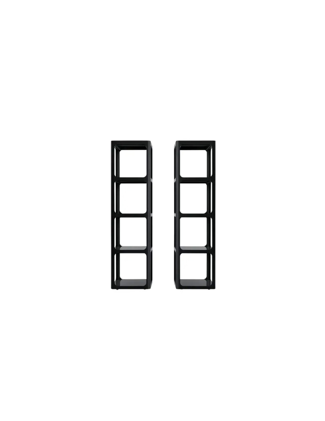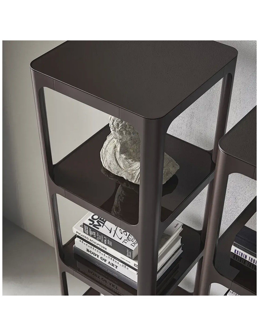 Una libreria dalla geometria essenziale, caratterizzata dal particolare raccordo fra la struttura e i piani, ottenuta grazie ad esclusive giunzioni a scomparsa. Disponibile in numerose varianti dimensionali, il sistema prevede la possibilità di abbinamento tra struttura in alluminio e piani in vetro, con finiture a contrasto o, nel caso delle versioni laccate, con colore uniforme