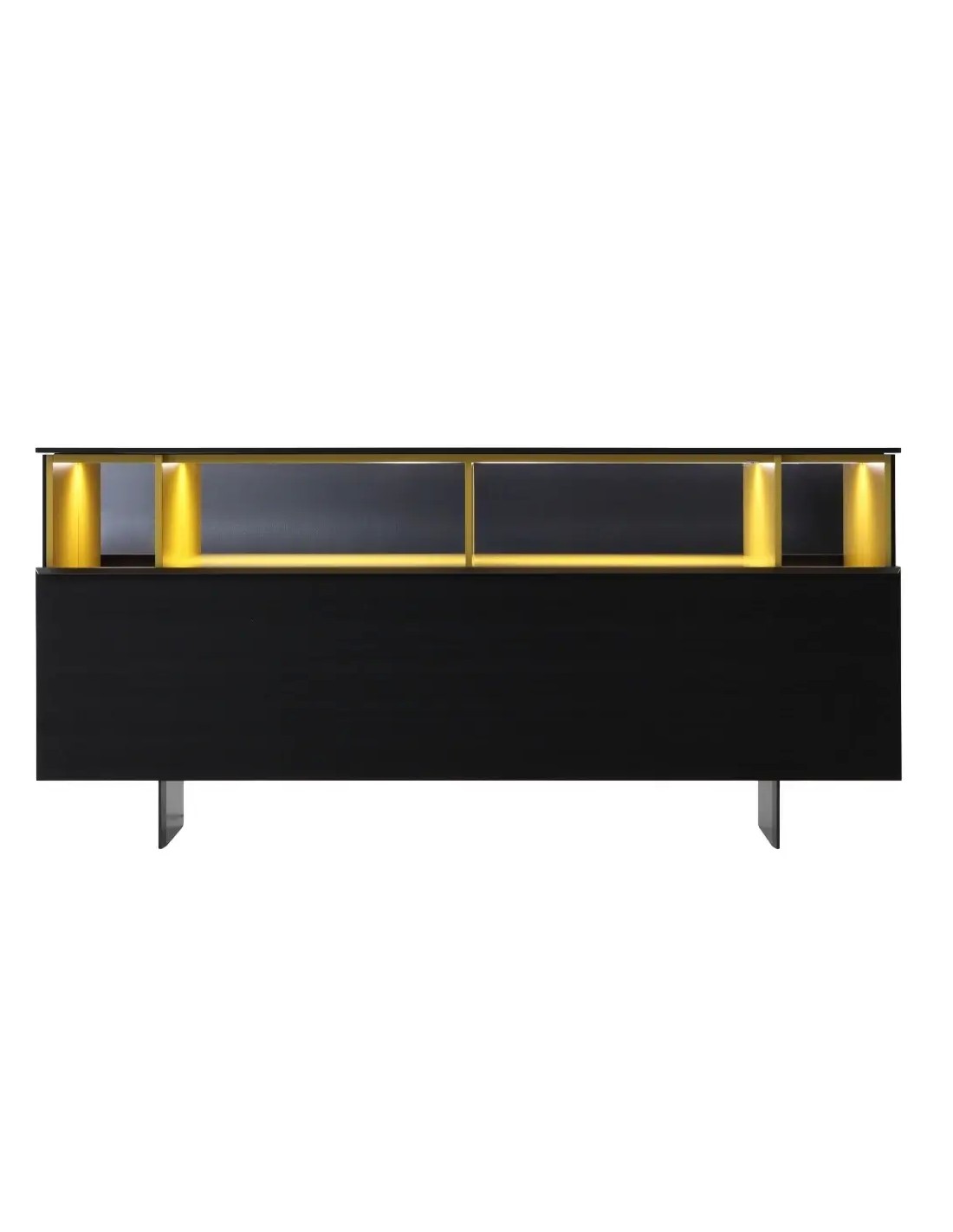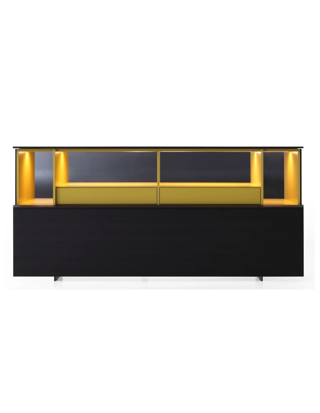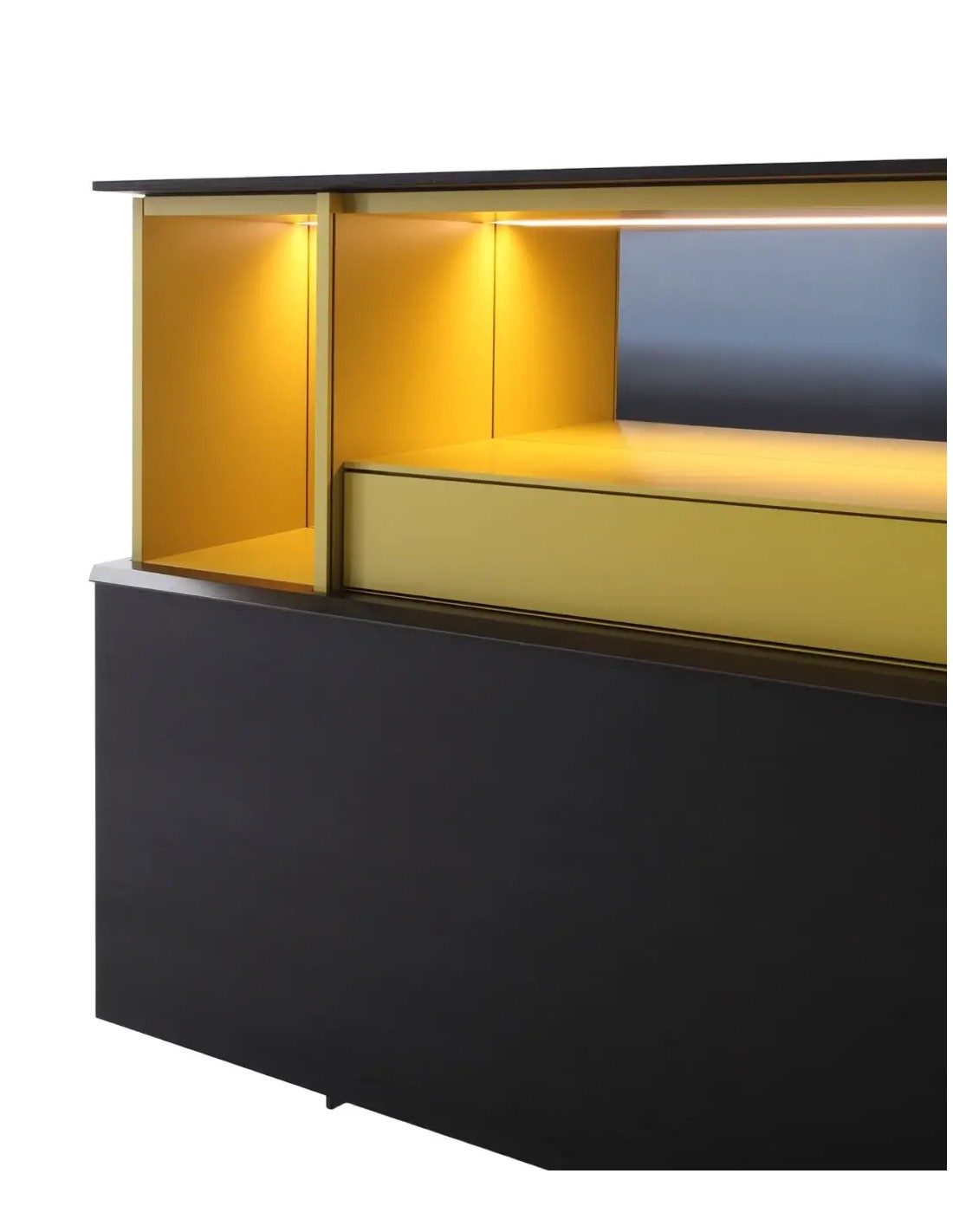 Il fascino di questa madia risiede anche nel peculiare effetto creato dal fondale a specchio che regala luminosità e preziosità agli interni in laccato opaco, in uno dei colori della collezione. Il top della madia è disponibile in tantissime varianti: dal laccato opaco o lucido, passando per i legni Porro fino ad una selezione di raffinati ed eleganti marmi, disponibili in finitura opaca o lucida.