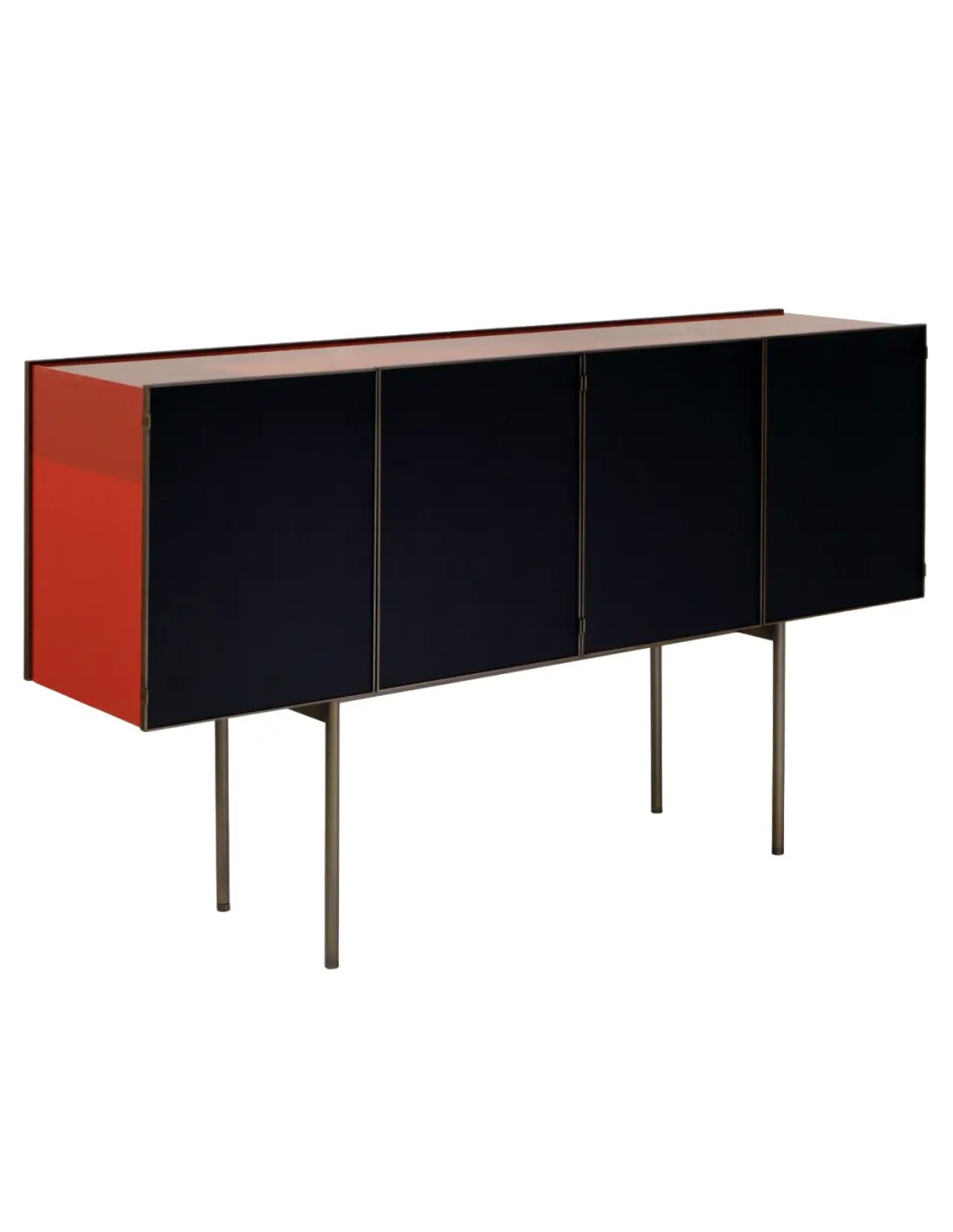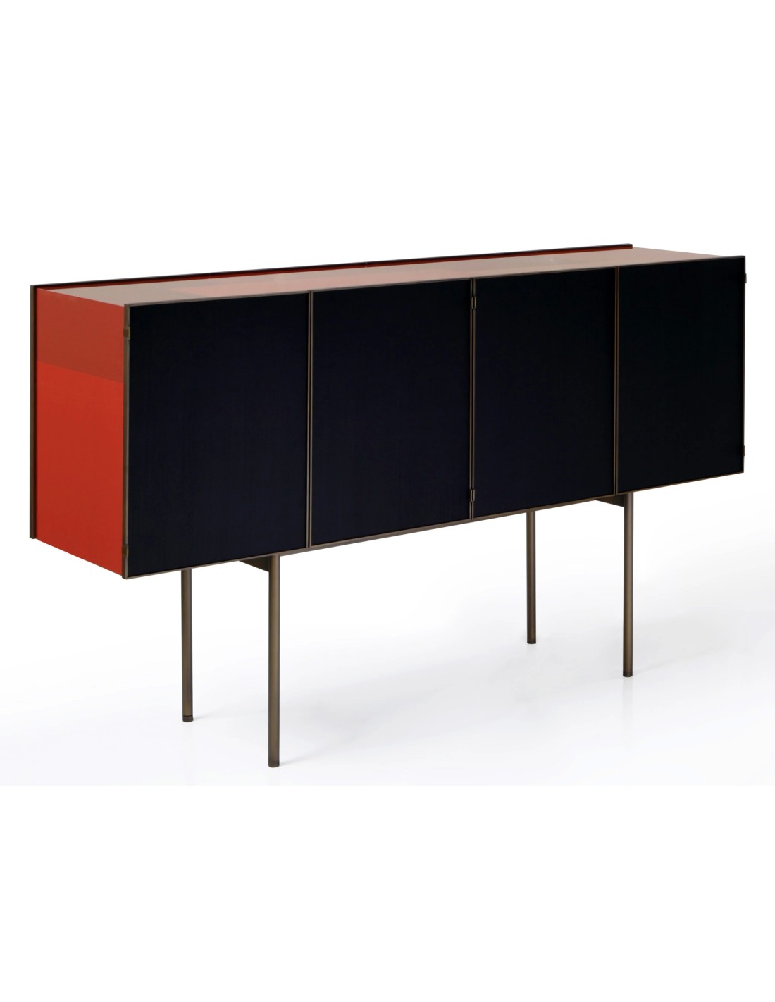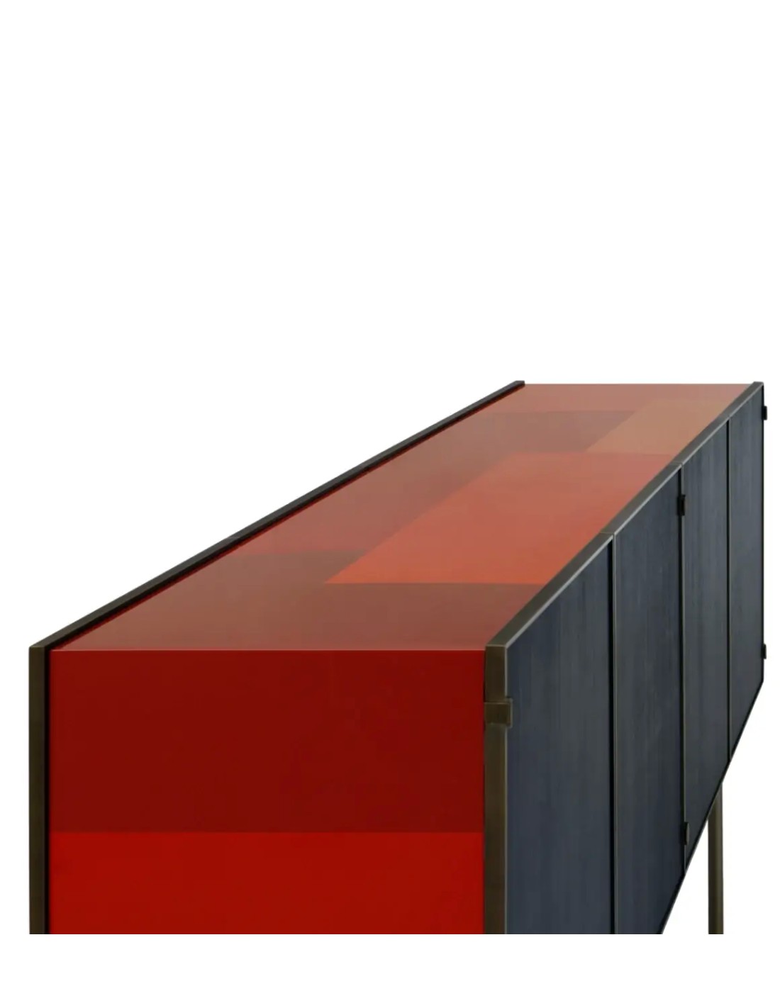Caratterizzate dalle garbate proporzioni e dal colore brillante e profondo sono declinate in due formati: una madia complanare bassa, ideale per il living o la camera da letto, e una madia più alta a 4 ante battenti, perfetta nel dining per riporre stoviglie ed oggetti. La struttura e i frontali sono in hemlock tinto nero mentre il colore mostra tutto il suo fascino sul top e sui fianchi nelle gradazioni dall'arancio fino al rosso. Il profilo delle ante e i piedini sono in invece ottone brunito.