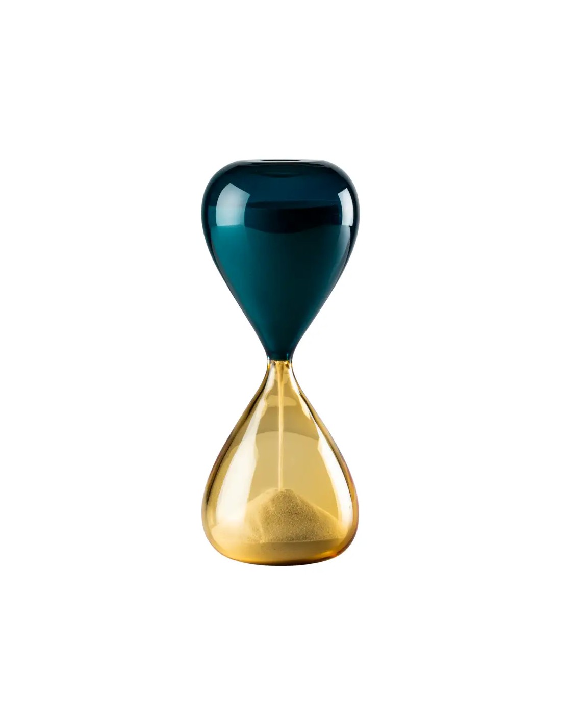 Granelli di sabbia, impalpabili, impercettibili, invisibili eppure così presenti, come il tempo che passa, arriva e poi riparte. In perenne equilibrio tra due cromie diverse, la sabbia passa tra due soffi di vetro assumendone il colore e diventandone parte.