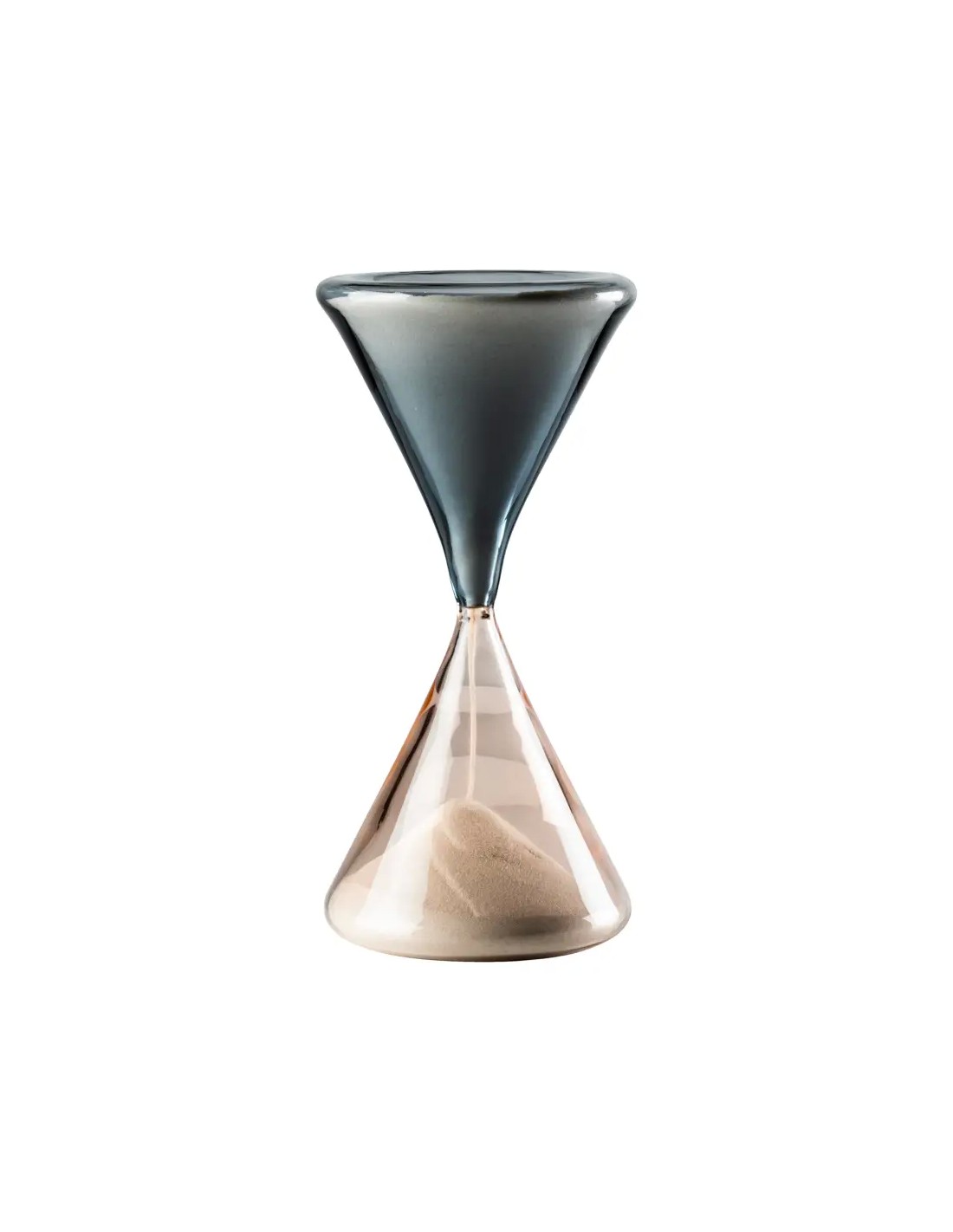 Granelli di sabbia, impalpabili, impercettibili, invisibili eppure così presenti, come il tempo che passa, arriva e poi riparte. In perenne equilibrio tra due cromie diverse, la sabbia passa tra due soffi di vetro assumendone il colore e diventandone parte.