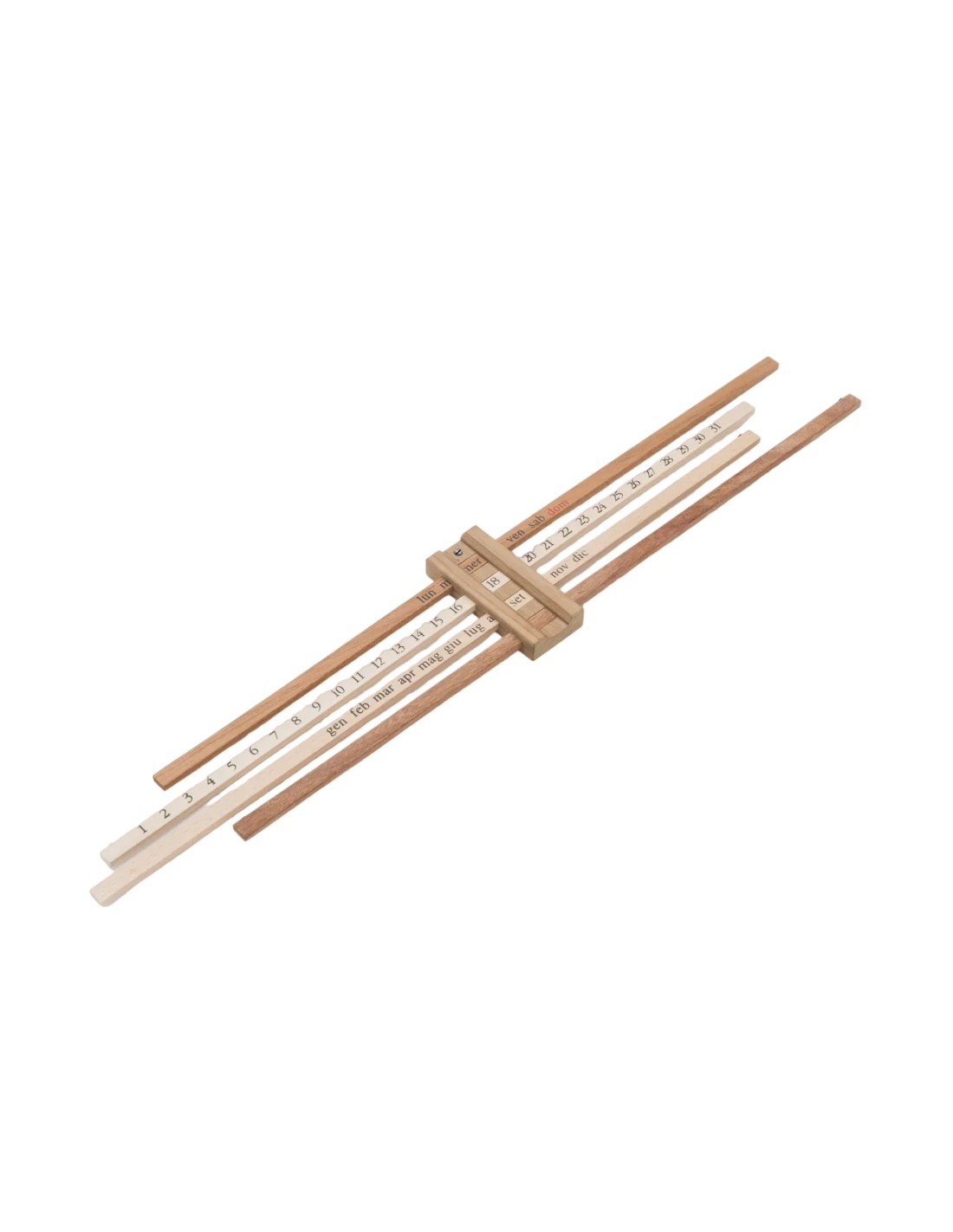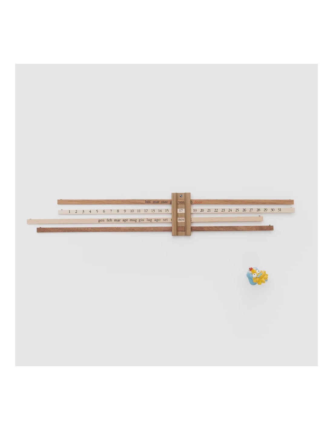 Calendario bilancia è un calendario da parete che attraverso la gestualità pone l'accento sullo passare del tempo. Costituito da un perno centrale in legno dove scorrono orizzontalmente quattro liste di legno di diverse essenze. Ognuna ha stampati in serigrafia i giorni, i numeri e i mesi. La struttura gioca sull'equilibrio delle piccole aste e ribalta la tipologia della funzione di una bilancia assegnandole la funzione di un calendario.