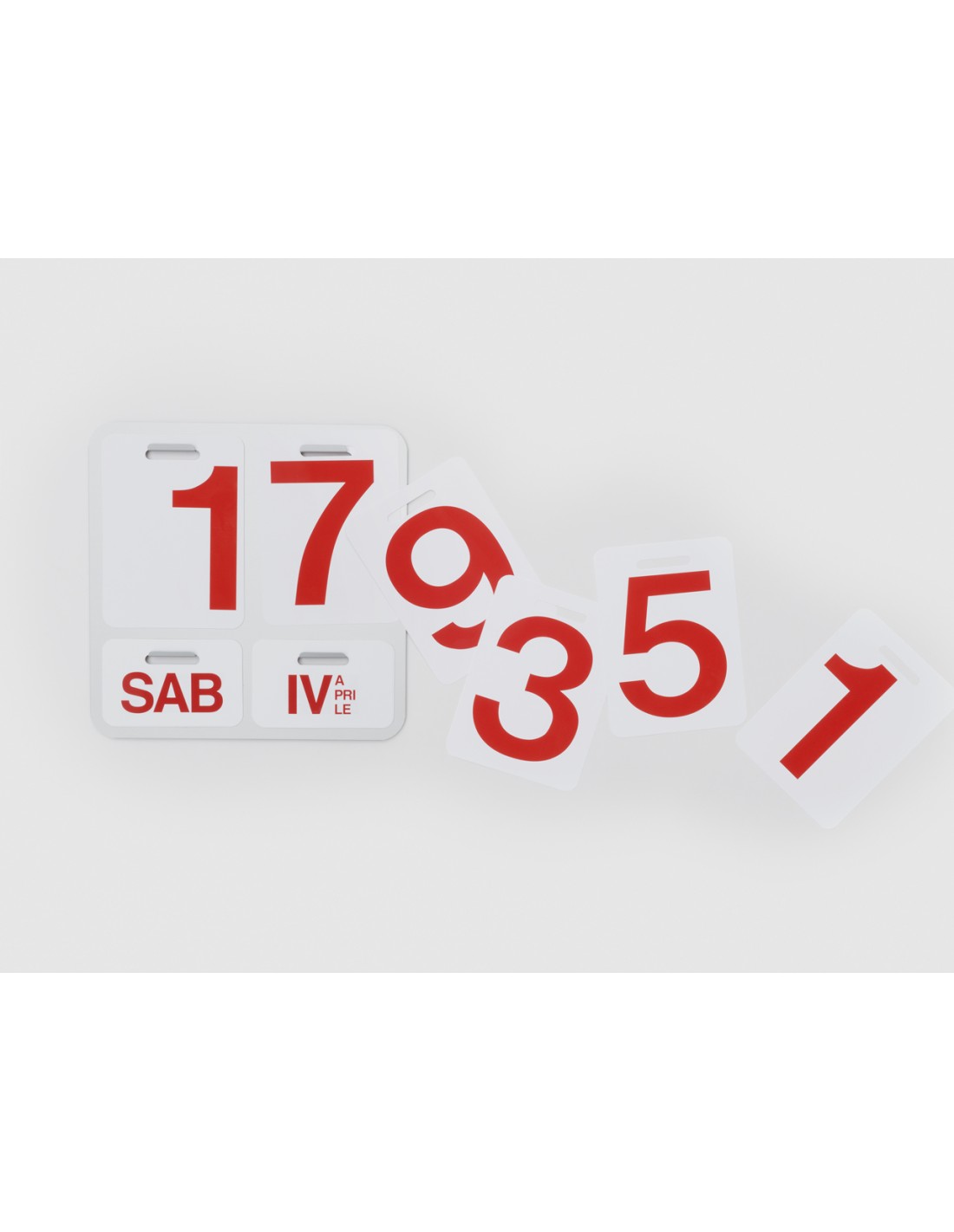 Danese MilanoFormosa è un calendario da parete costituito da una base attrezzata in alluminio che fa da supporto ai fogli mobili in pvc che definiscono la data.