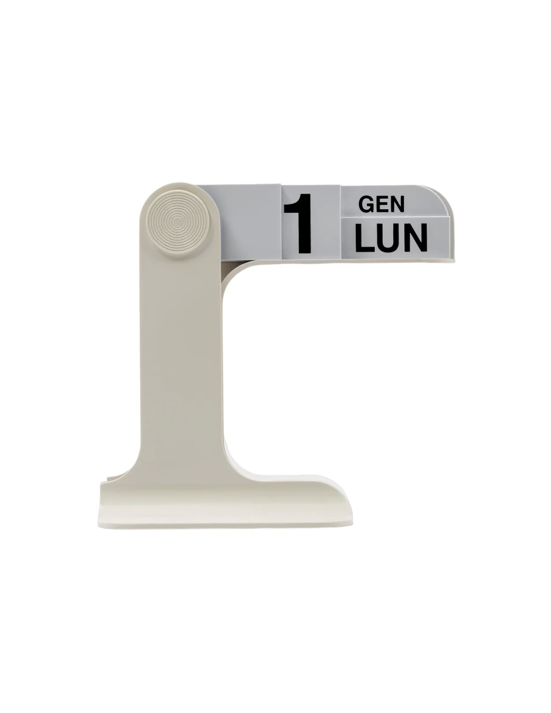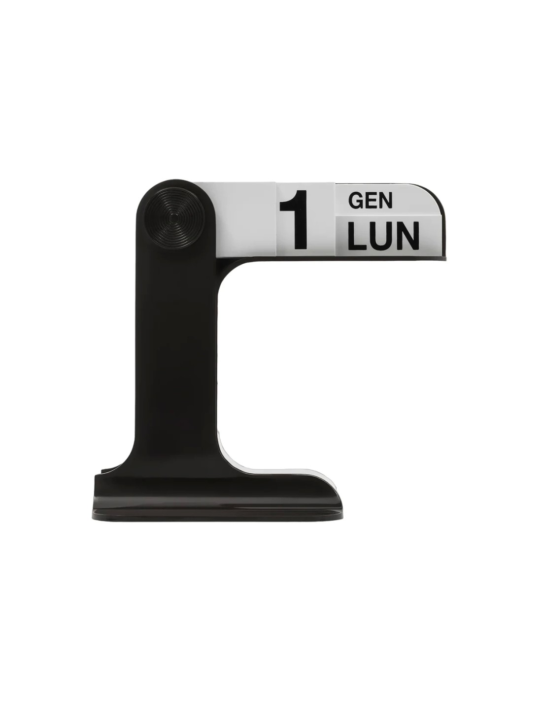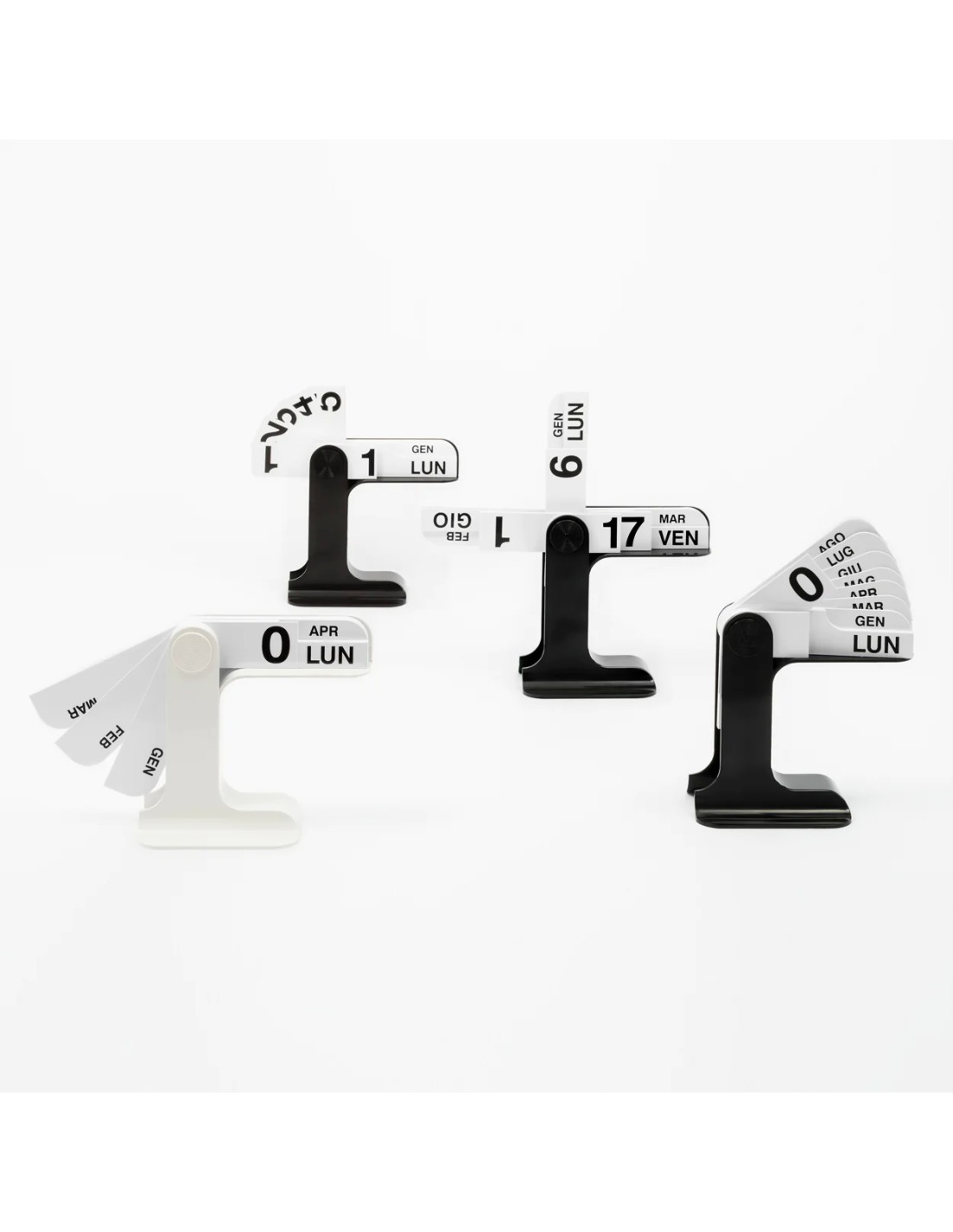 Danese MilanoTimor è un calendario perpetuo che grazie alle fascette in pvc apribili a ventaglio, consente di scegliere le palette che identificano mese, numero e giorno della settimana, fissate a un perno.