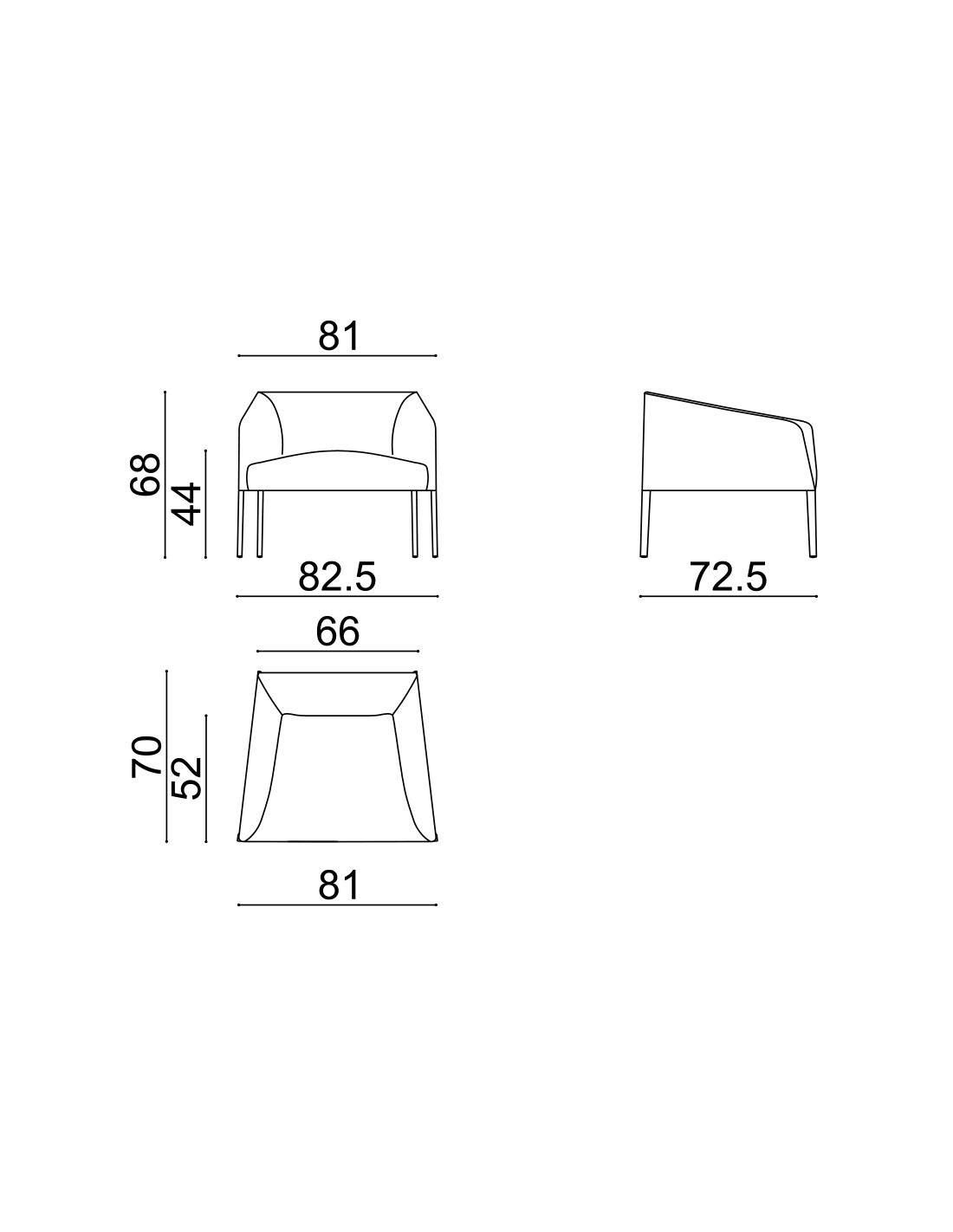 Poltrona (larghezza 82,5 cm) su fusto quattro gambe in acciaio lucido, verniciato o impiallacciato in legno precomposto effetto rovere.