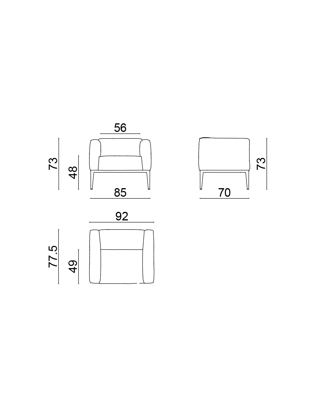 Poltrona imbottita con struttura in Mdf e gambe in alluminio verniciato. Rivestimento in tessuto, pelle, tessuto spalmato.