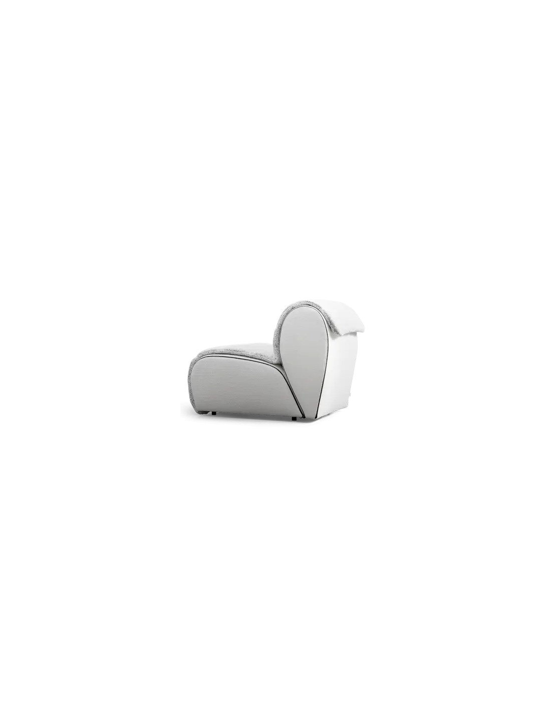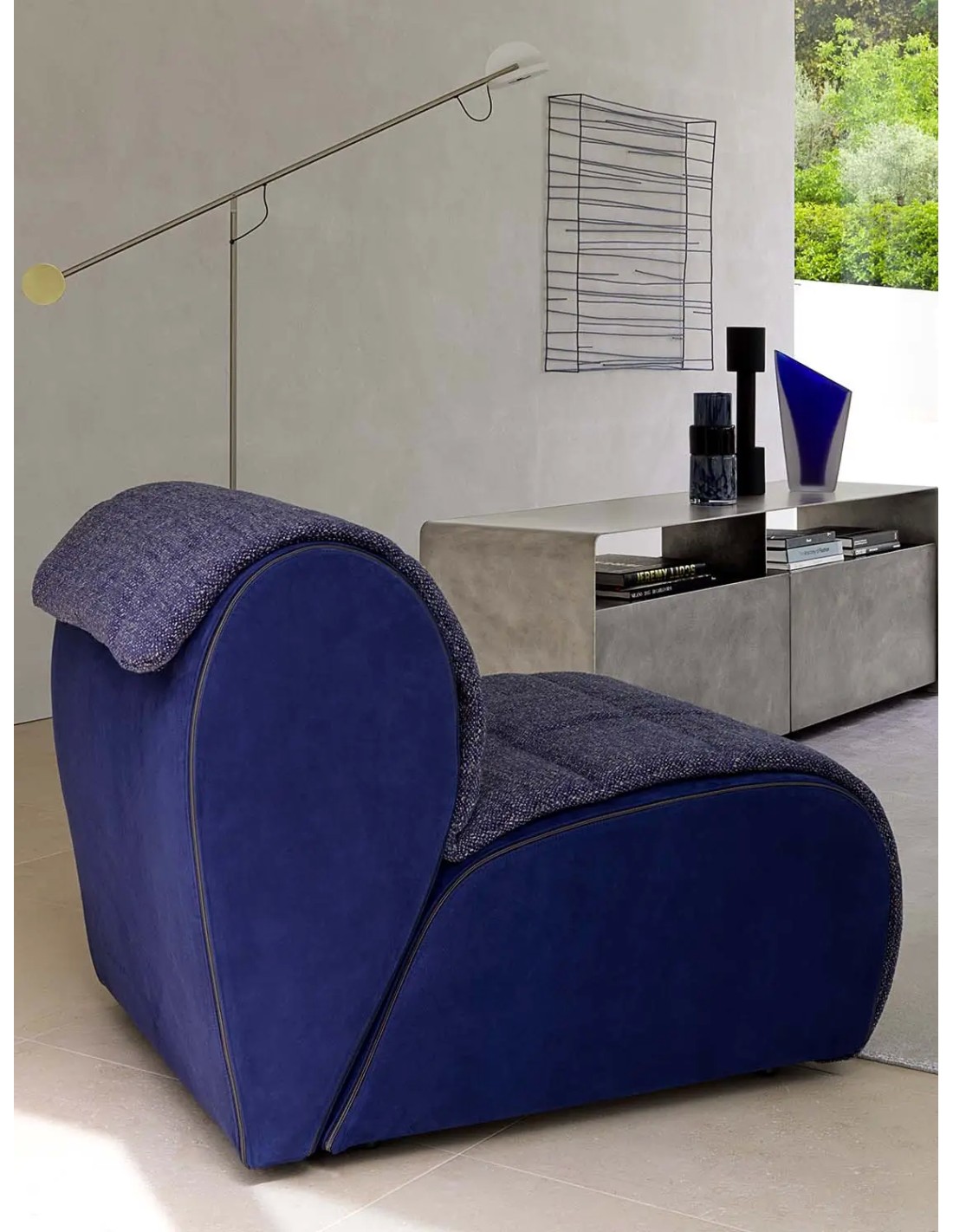 Un segno distintivo e funzionale della poltrona Flora è la presenza di cerniere nere che corrono lungo il profilo della seduta. Oltre a permettere una completa e agevole sfoderabilità, queste zip diventano un elemento grafico che sottolinea la forma curva del "petalo". Ad arricchire ulteriormente il comfort e l'estetica interviene il caratteristico mantello amovibile: fissato tramite velcro e stabilizzato da un contrappeso posteriore, questo elemento può essere scelto in tinta o a contrasto, aggiungendo uno strato di morbidezza e personalizzazione unico nel panorama delle poltrone imbottite.