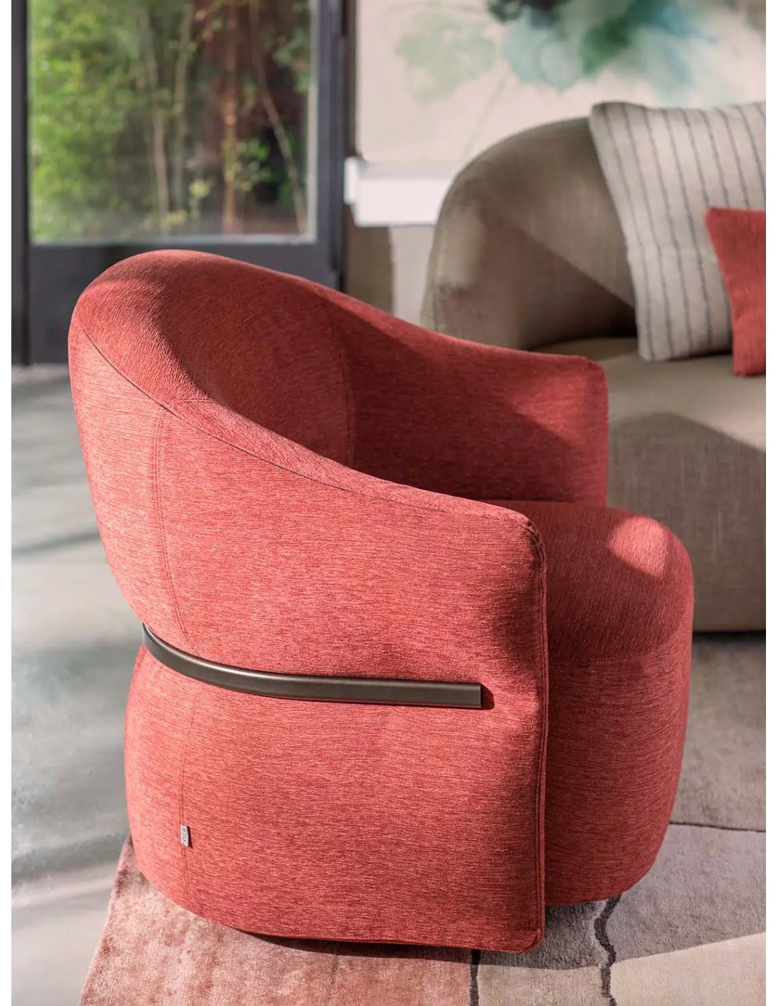 L'elemento che definisce l'identità della Madame Butterfly Flou è il sottile tubolare metallico che ne racchiude e delimita la parte esterna. Questa struttura, realizzata nella raffinata finitura Anodic Bronze (T010), non ha solo una funzione di sostegno, ma agisce come un segno grafico che esalta la morbidezza delle curve. Il metallo "abbraccia" l'imbottitura, creando un gioco di contrasti tra la solidità del bronzo anodico e la sofficità del rivestimento tessile o in pelle, rendendo questa poltrona di design un pezzo unico nel panorama dell'arredo contemporaneo.