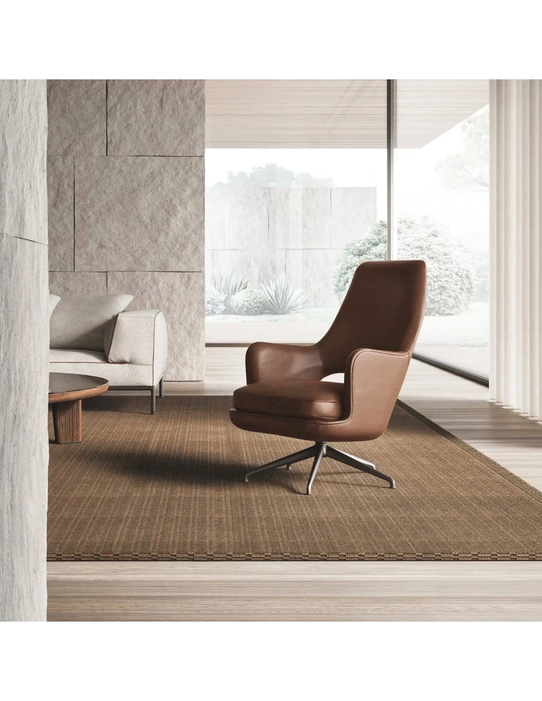 Il contrasto materico tra la morbidezza della seduta e la solidità della base è uno dei tratti distintivi del progetto. I basamenti, siano essi in legno o in metallo, sono disegnati con una cura architettonica che solleva la poltrona da terra, conferendole una presenza scenica importante ma equilibrata, tipica del linguaggio stilistico Flexform.
