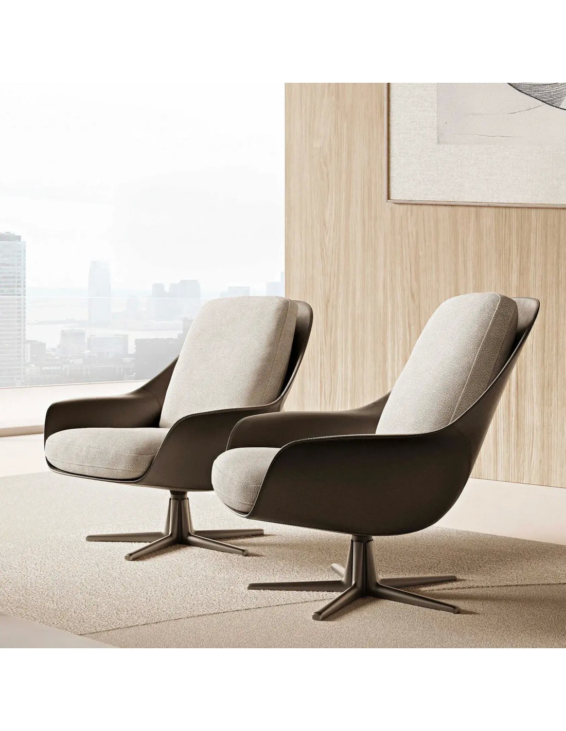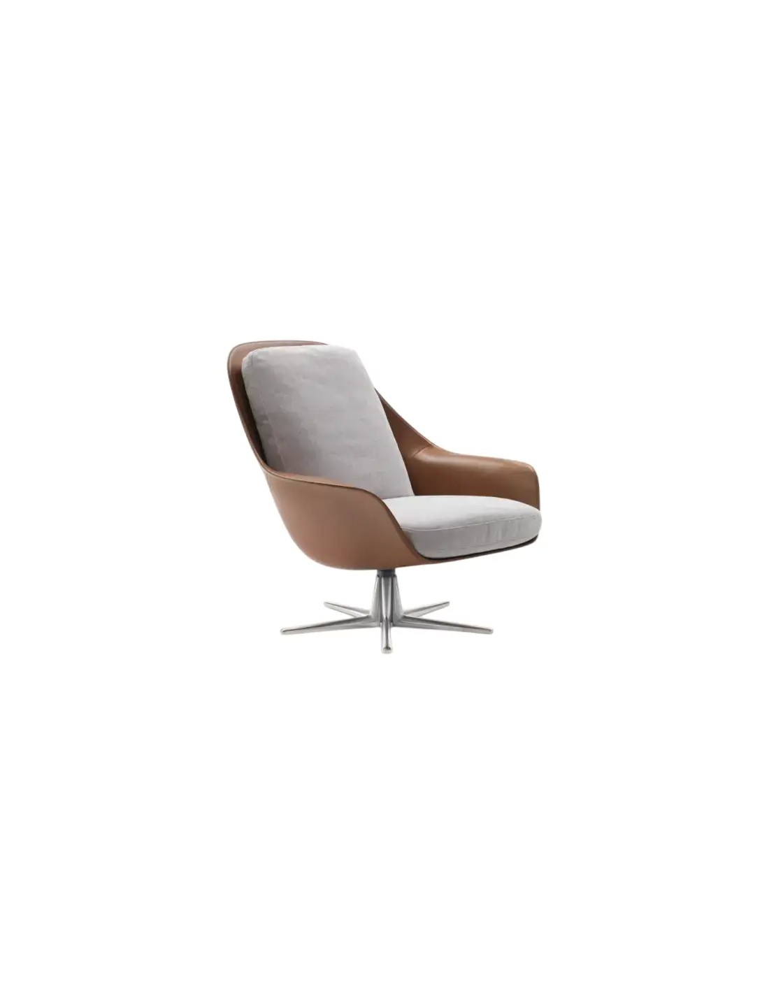 Il basamento girevole in alluminio pressofuso, disponibile a quattro o cinque razze, è un elemento di alta ingegneria che permette alla poltrona di ruotare con fluidità, rendendola ideale per zone living dinamiche o uffici direzionali di prestigio. Le diverse finiture del metallo (dal cromo nero al brunito) permettono di creare un dialogo cromatico perfetto con il cuoio scelto per il guscio.