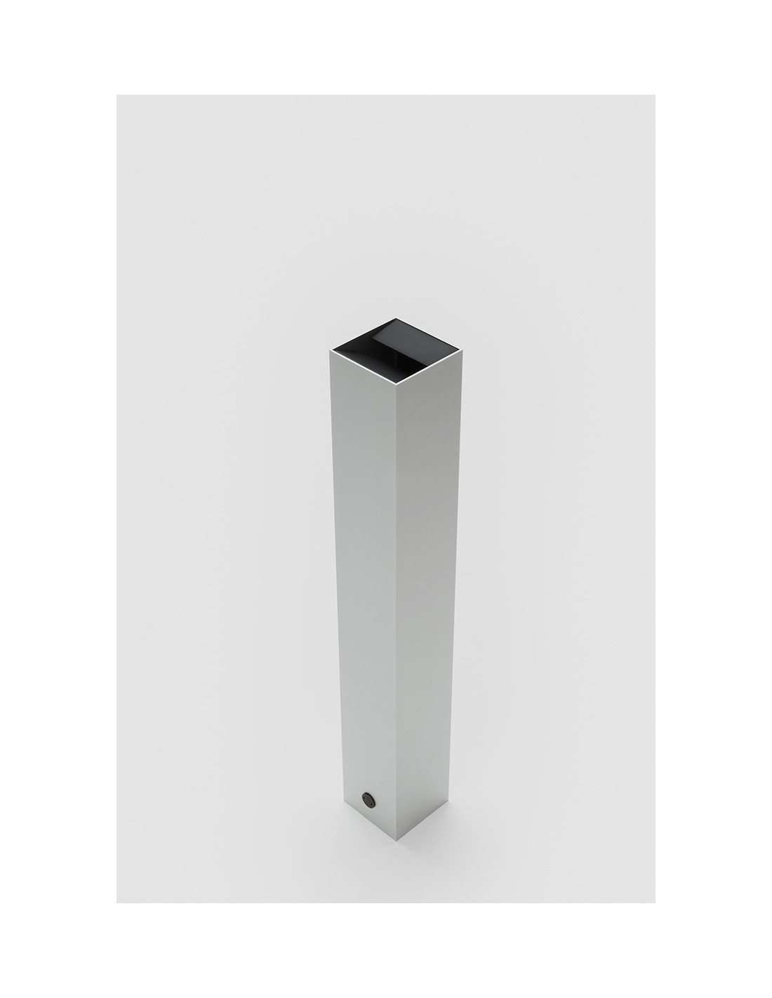 Danese MilanoPonza è un posacenere da terra. Costituito da un foglio di alluminio piegato e inserito nel tubo di metallo a sezione quadrata, è a sua volta removibile per essere svuotato.