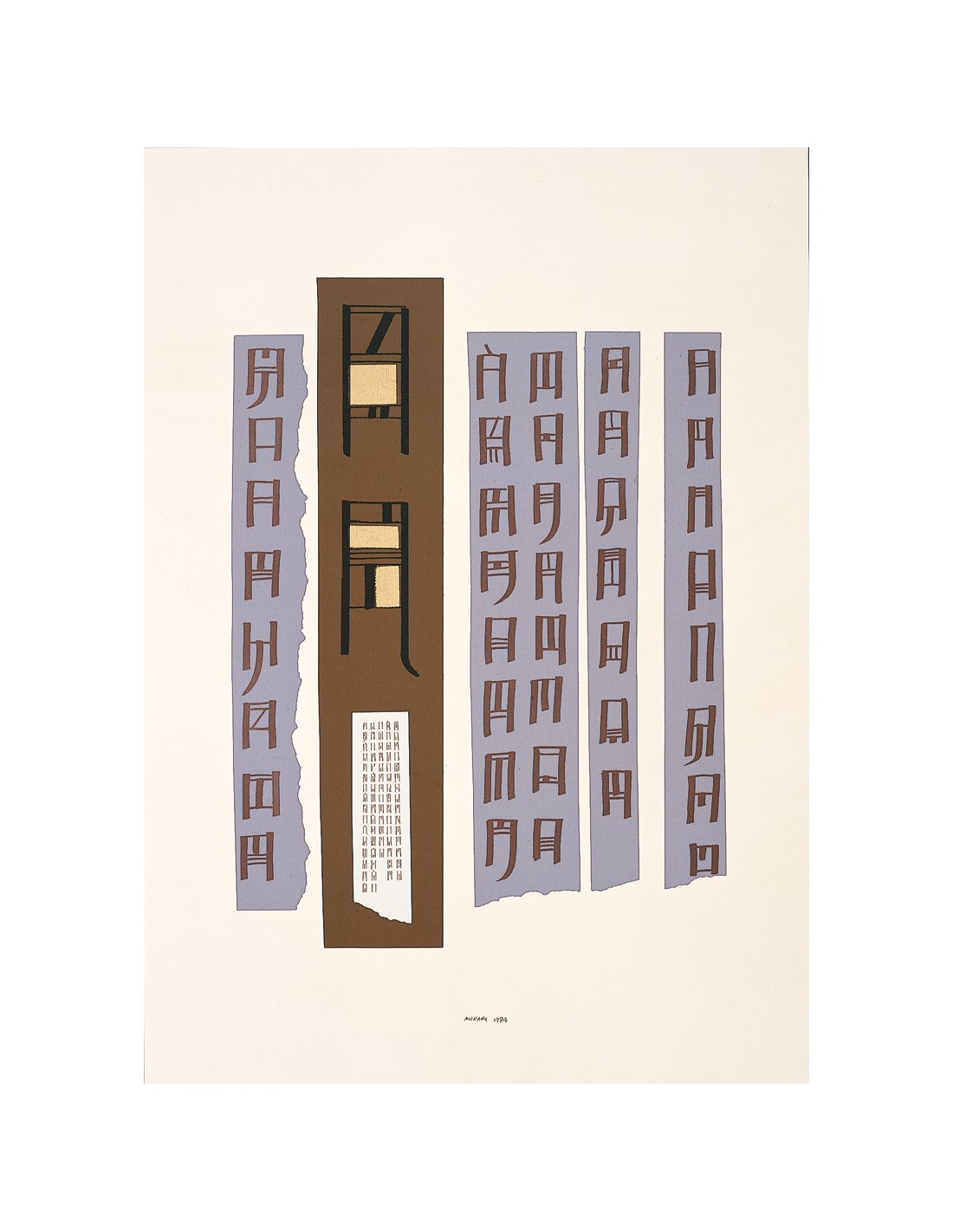 Danese MilanoScrittura illeggibile bianco è una serigrafia a quattro colori. L'idea nasce dall'osservazione di scritte di cui, anche senza leggere i testi ma soltanto osservandoli col senso