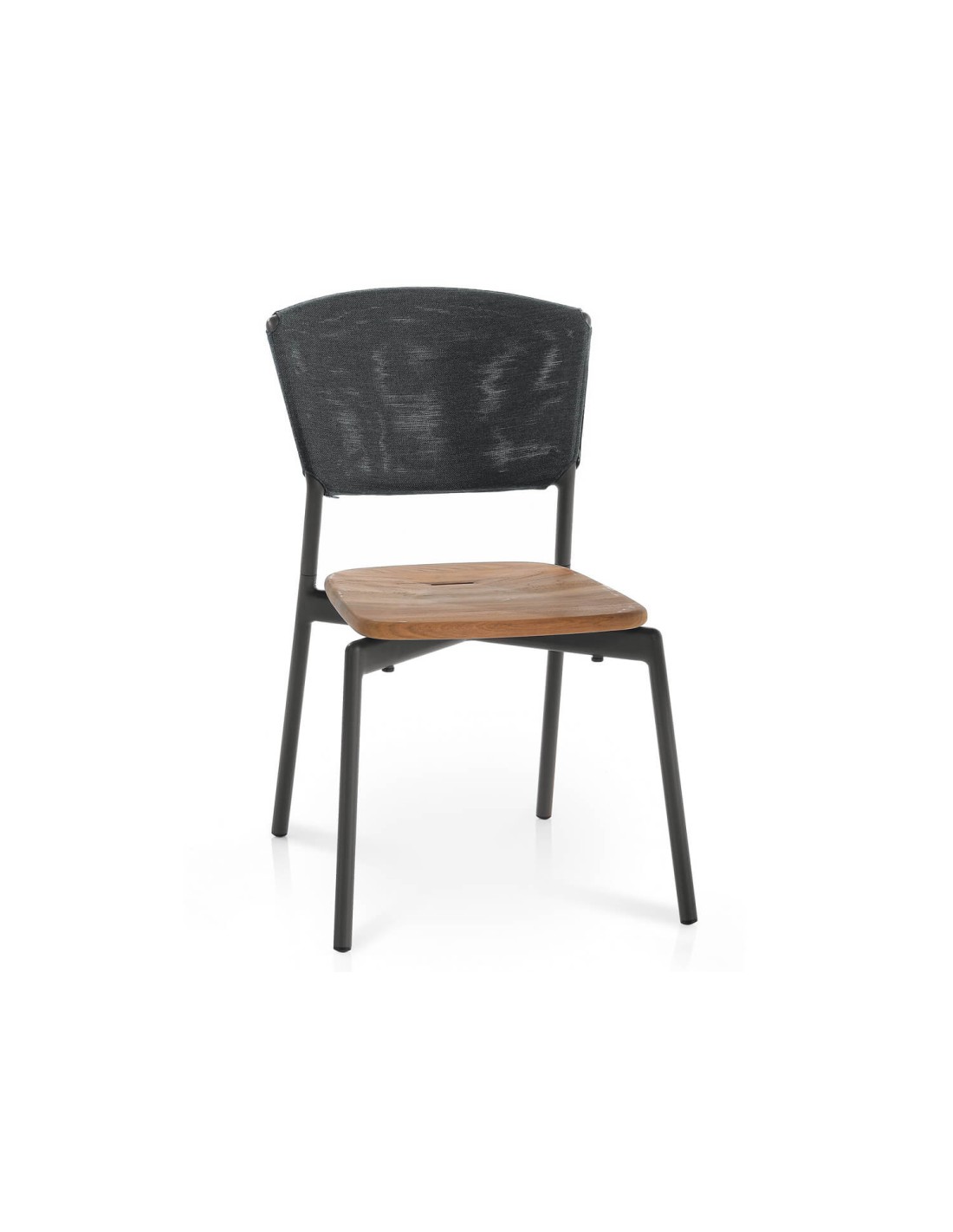 La combinazione dei materiali si amplia ulteriormente con la seduta: più morbida in teak o più tecnica in resina poliuretanica, di colore mole. Il cuscino, dotato di una spina di fissaggio che si inserisce nella fessura di scolo della seduta, è realizzato nei tessuti outdoor dell'ampia offerta di RODA: un ulteriore tocco di colore per creare abbinamenti inediti ma mai scontati.