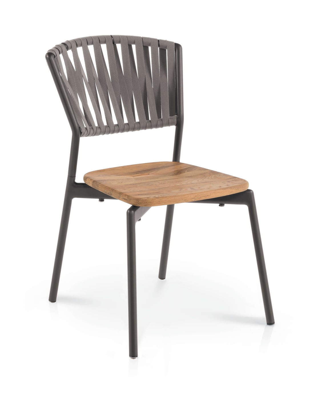 PIPER propone e una varietà di sedie per esterno impilabili, con e senza braccioli, e poltroncine pranzo caratterizzate dalla struttura in tubolare di alluminio abbinata, per la sedia PIPER 120, all'intreccio di cinghie in poliestere o acrilico che riveste lo schienale.