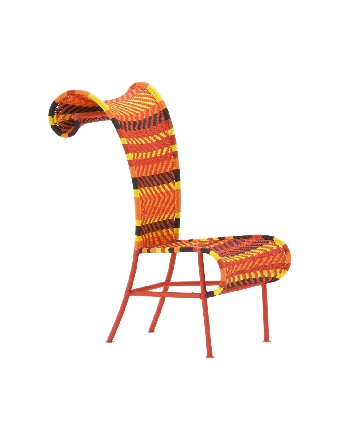 Collezione realizzata intrecciando il filato utilizzato per le reti da pesca, progetti non-omologati per antonomasia, diversi e originali, prodotti lavorati a mano, umani nel raccontare pregi e difetti. Struttura in acciaio verniciato e fili colorati in polietilene intrecciati a mano. Sottopiedi in PVC.