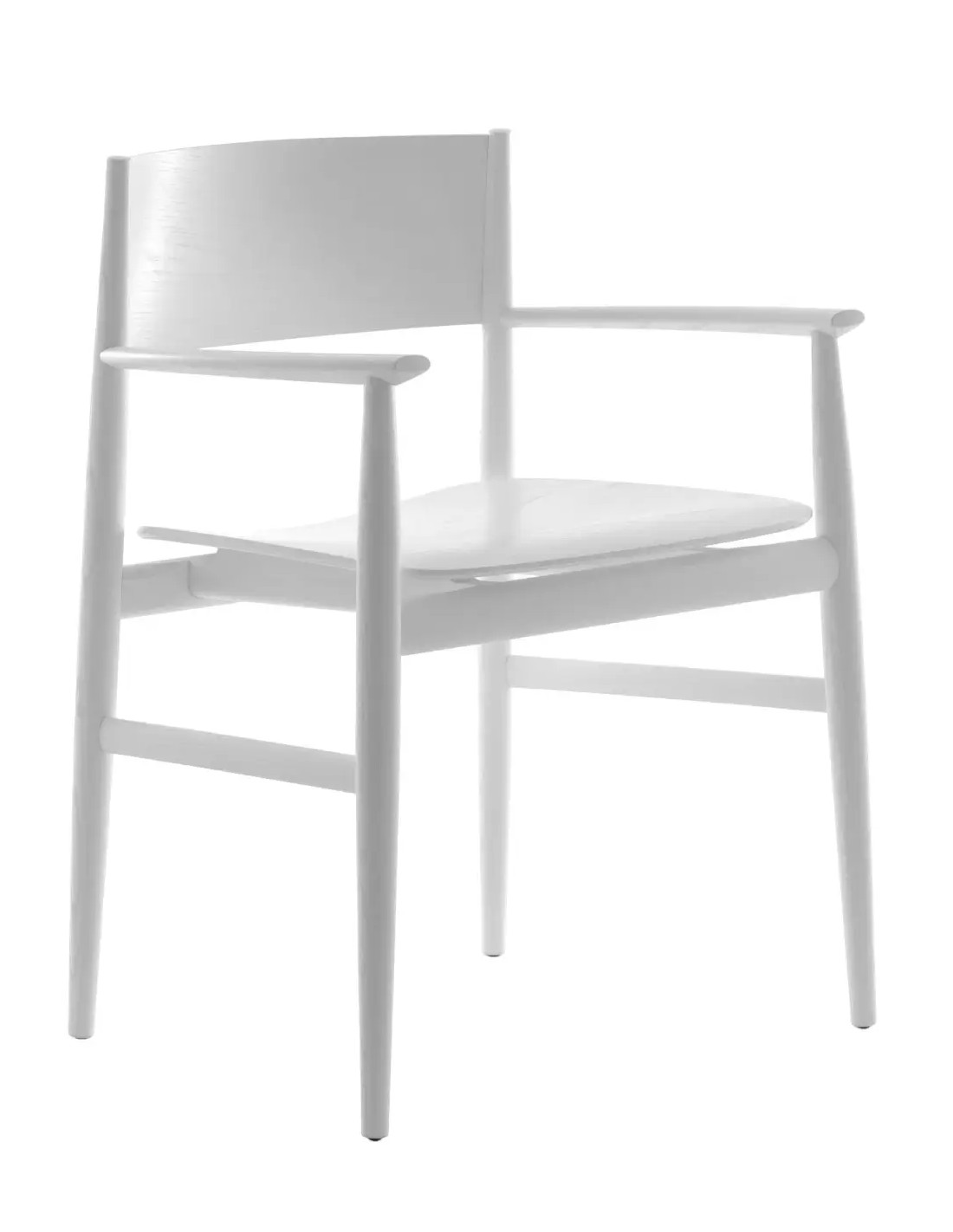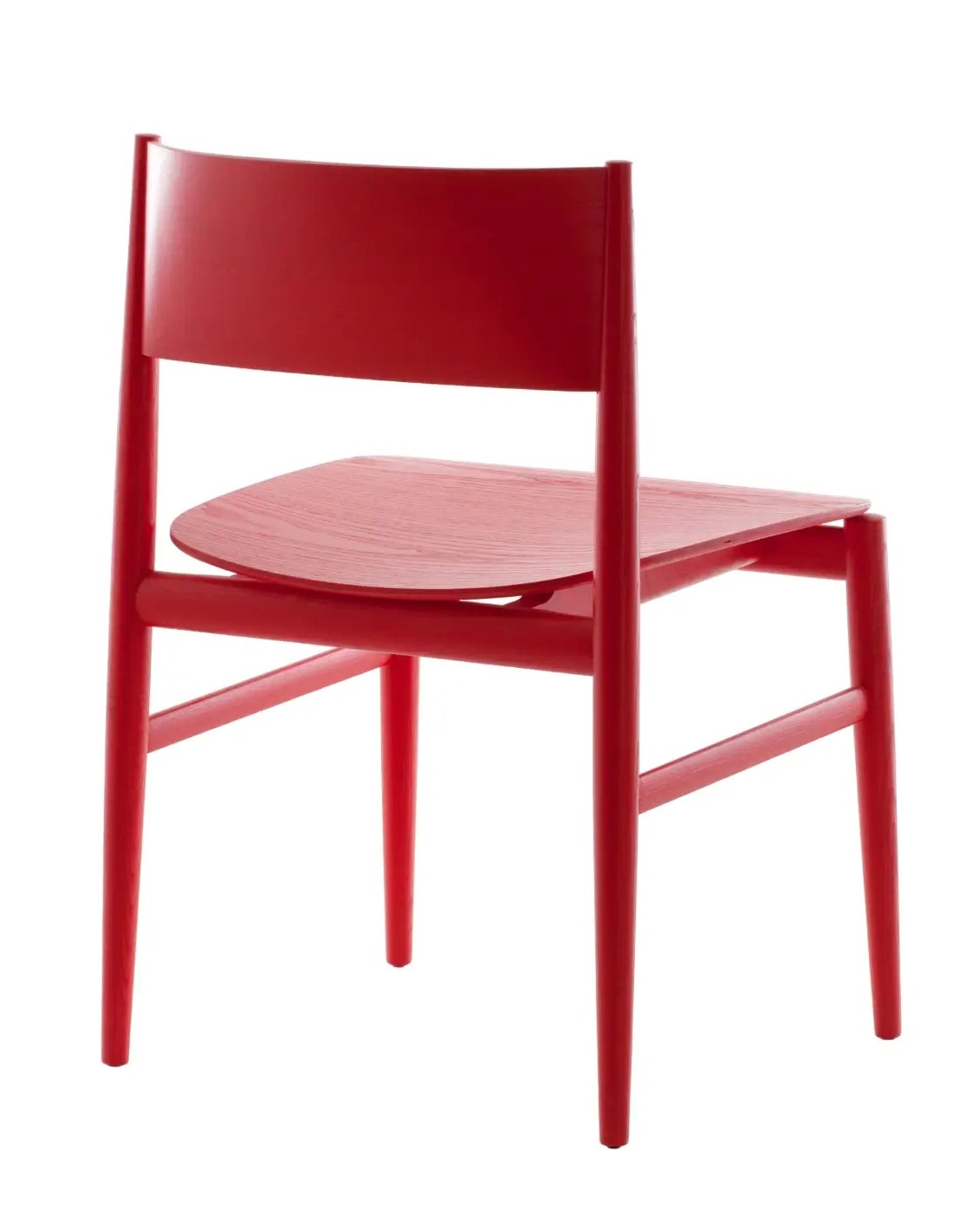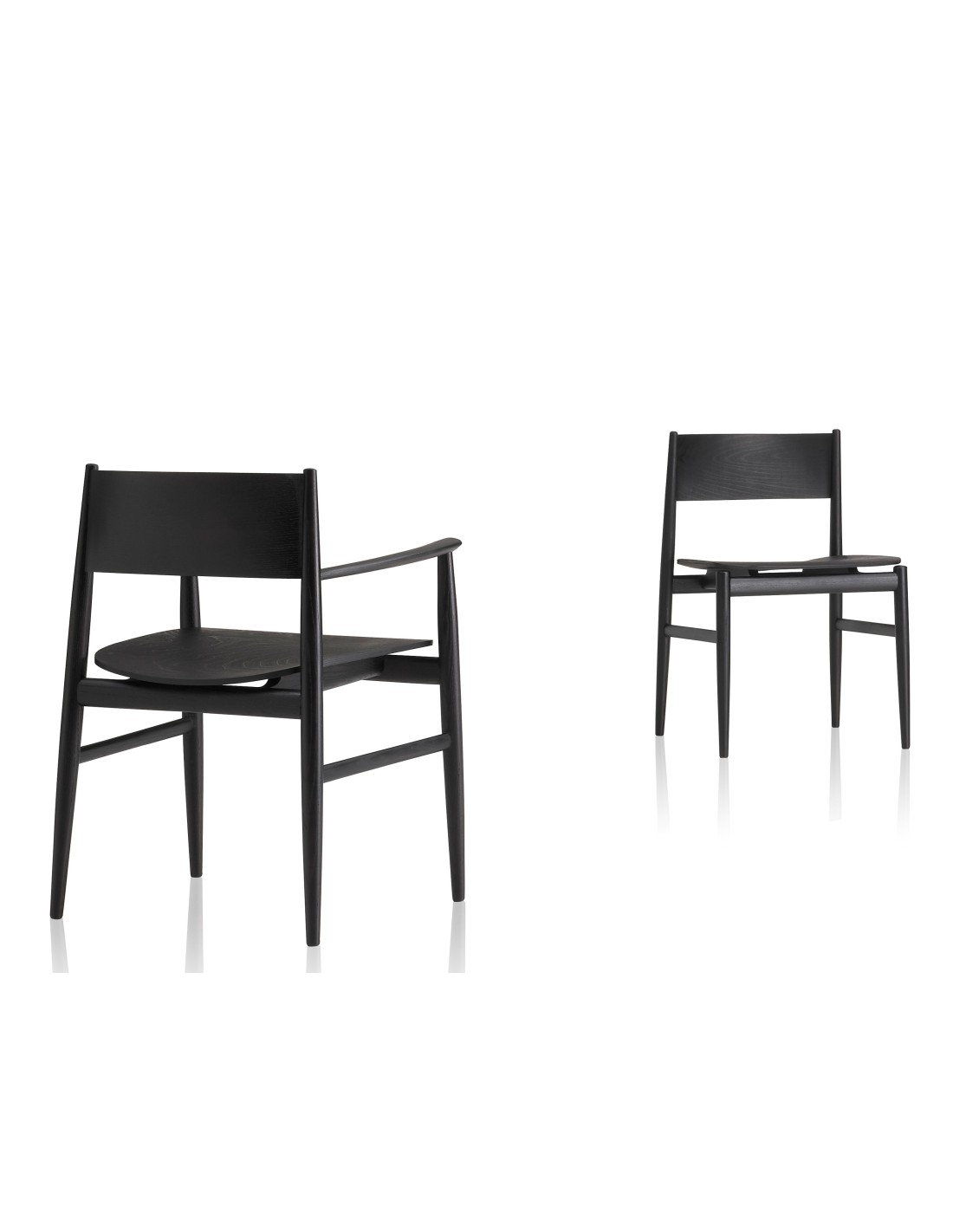 Seduta dalle linee rigorose ma morbide, Neve reinterpreta in chiave contemporanea la classica sedia in legno. Se la struttura di sostegno si caratterizza per un tracciato di linee nette dai diversi spessori, leggermente inclinate, la rotondita delle gambe a fuso e la tenue curvatura dello schienale e della seduta sospesa addolciscono la sua figura, rendendola estremamente intima e accogliente.