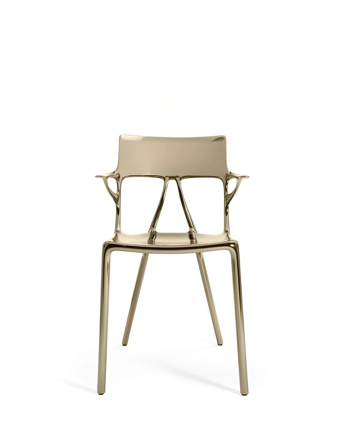 KartellA.I. Metal è la nuova versione metallizzata della sedia realizzata utilizzando per la prima volta materiale riciclato in cui qualità estetica e requisiti strutturali restano imm