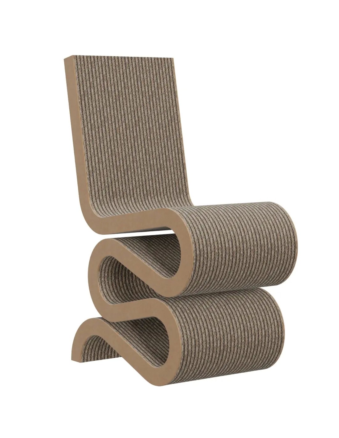 La Wiggle Side Chair si caratterizza per la sua forma scultorea e dinamica. La struttura è ottenuta piegando e modellando fogli di cartone secondo linee curve e sinuose che ricordano il profilo di una sedia Windsor.