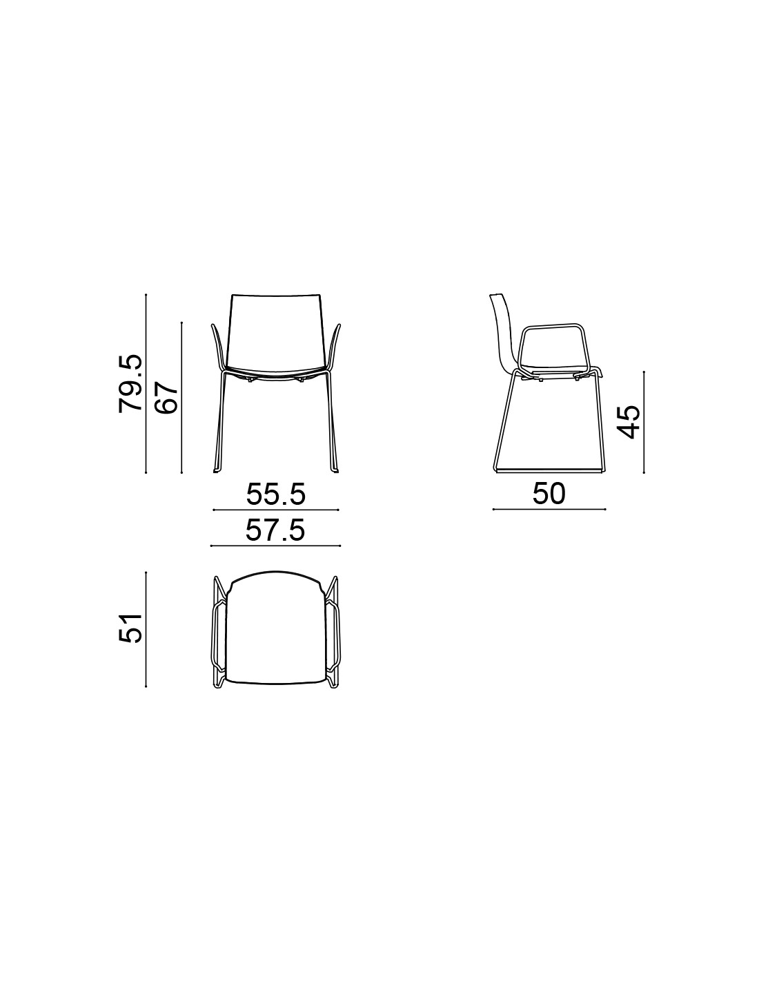 Seduta su fusto a slitta in acciaio cromato o verniciato e scocca in polipropilene monocolore, polipropilene bicolore, oppure rivestita in cuoio senza imbottitura. Su richiesta sono disponibili - senza sovrapprezzo - piedini per pavimenti in legno. In optional sono disponibili braccioli in acciaio e in polipropilene.