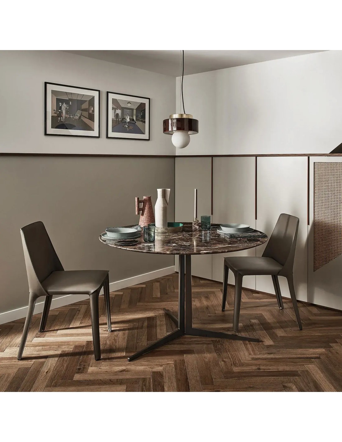 La particolarità della Isabel risiede nella continuità del rivestimento: il cuoio avvolge ogni parte della sedia, dalle gambe affusolate allo schienale leggermente inclinato, fino ai braccioli che nella versione poltroncina sembrano scaturire organicamente dal corpo centrale. Questa precisione costruttiva richiede una maestria artigianale che solo Flexform può garantire.