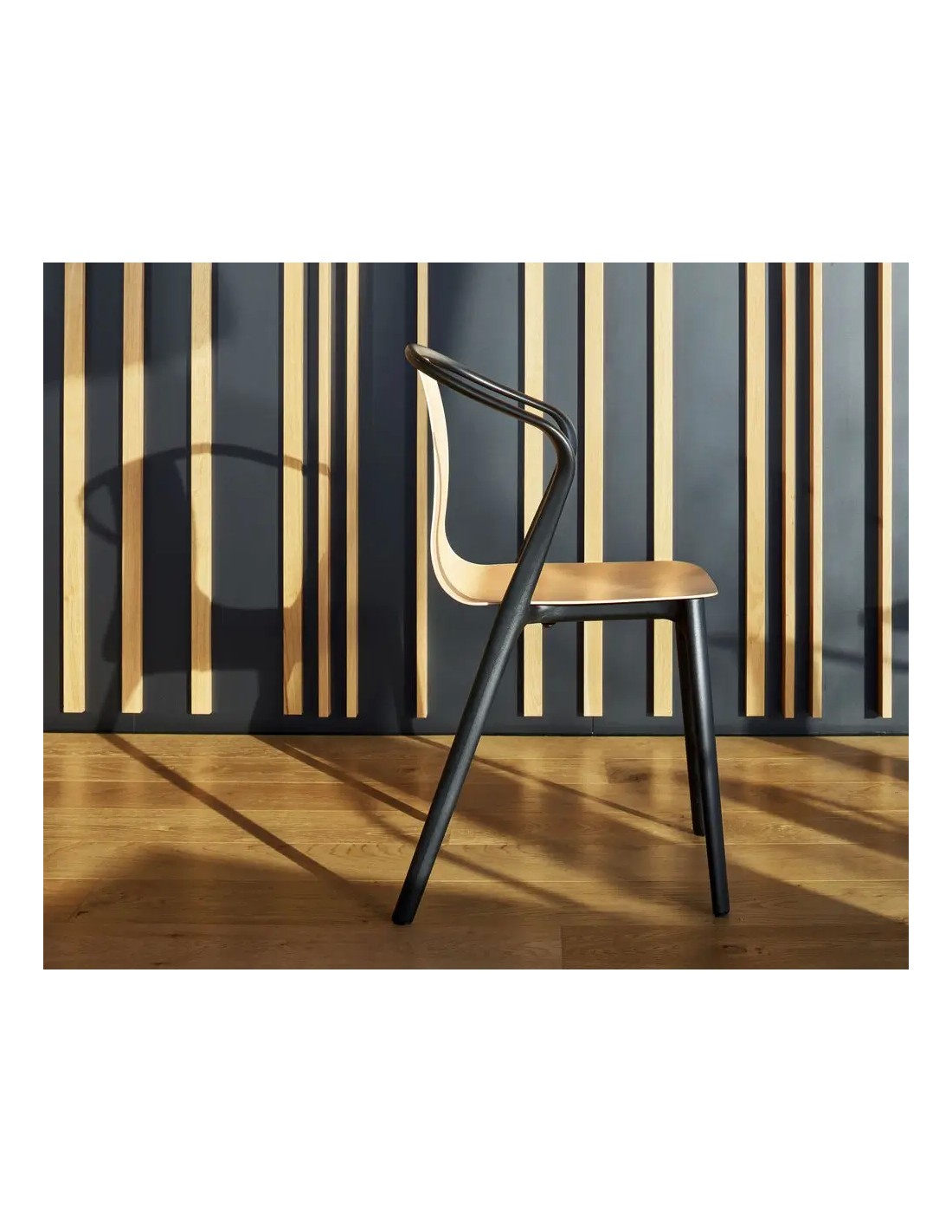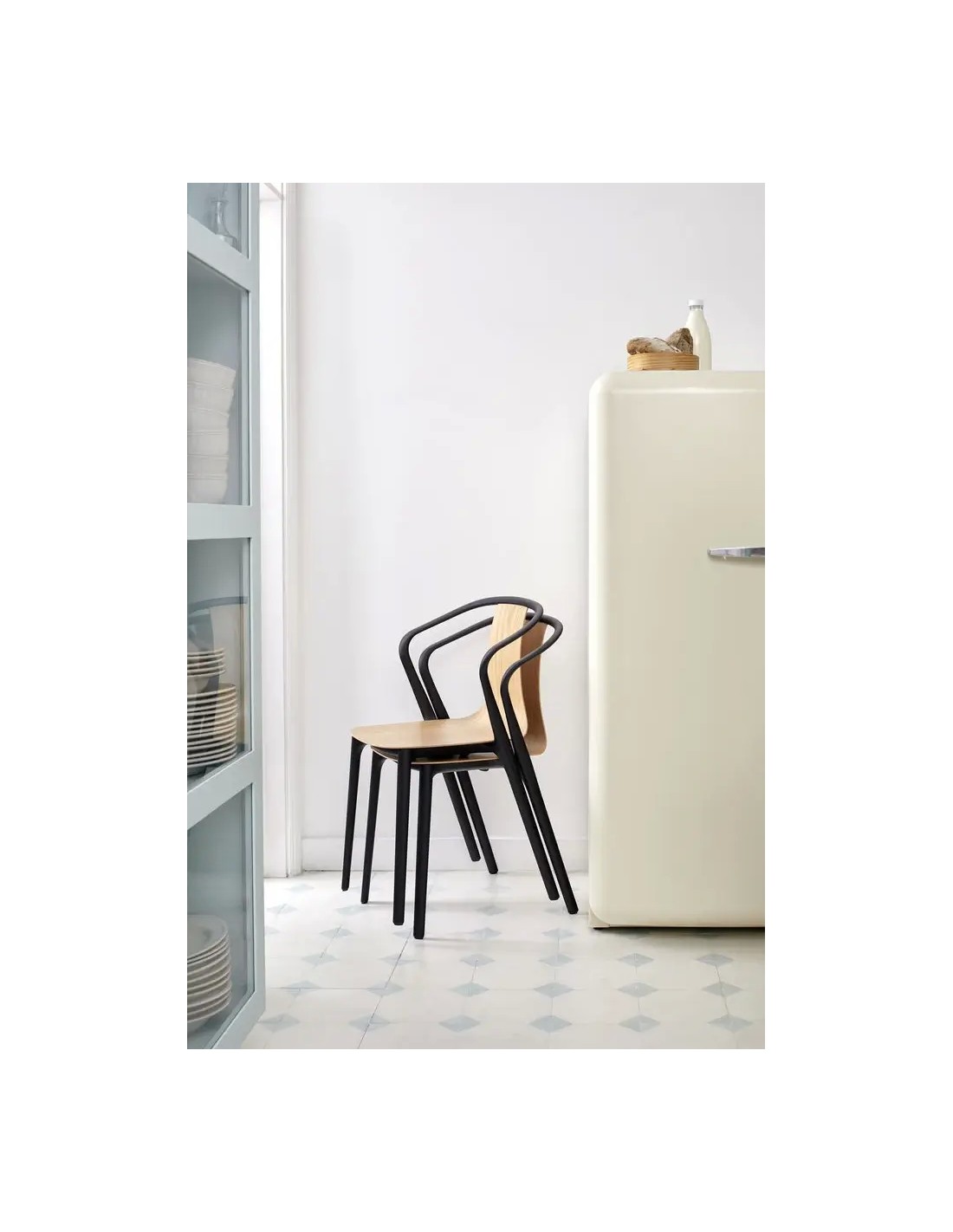 I materiali a contrasto della scocca in legno multistrato impiallacciato e sagomato e il lineare telaio in plastica nera costituiscono una caratteristica distintiva della Belleville Armchair. I suoi eleganti braccioli sono parte integrante della struttura curva del telaio e offrono un eccellente comfort. La Belleville Armchair è disponibile anche con scocca in plastica o con rivestimento in pelle o tessuto.