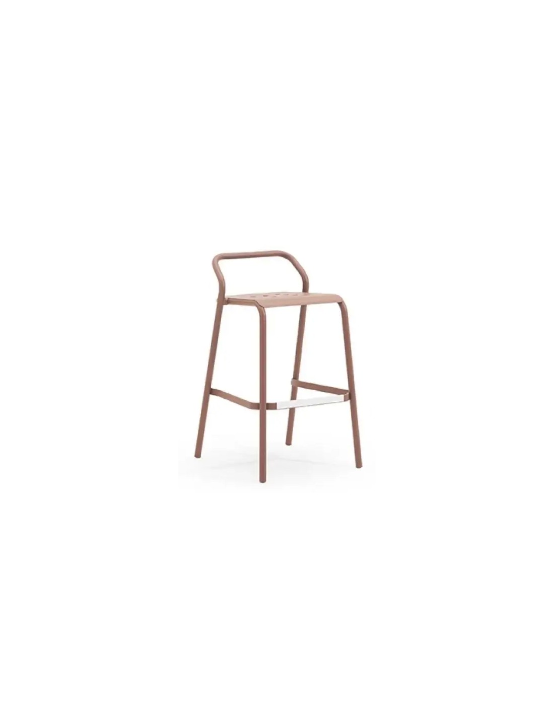 Il design di questa seduta nasce da un ben calibrato dialogo tra pieni e vuoti, creato dall'unione della struttura in tubo di alluminio che descrive in outline la silhouette dello sgabello, con il sedile in lamiera forata.