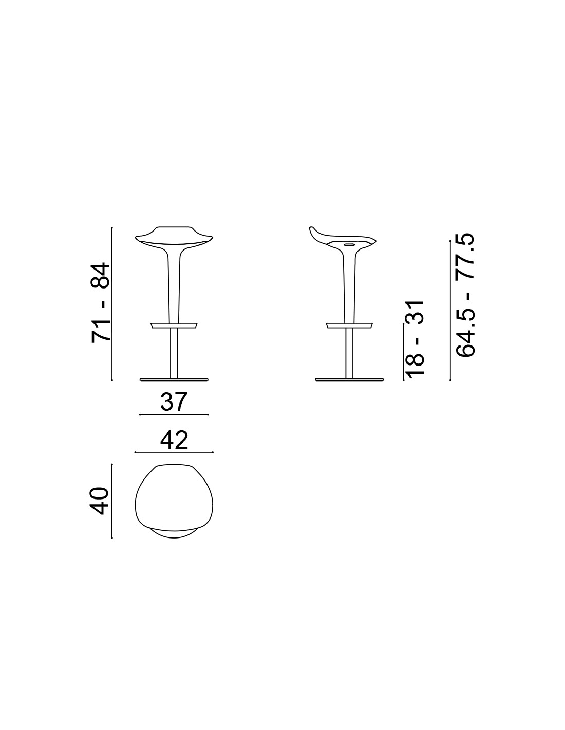 Regolabile in altezza oppure - su richiesta - con altezza fissa della seduta compresa tra 63.5 e 76.5 cm. Stelo in ABS disponibile in 2 varianti colore.