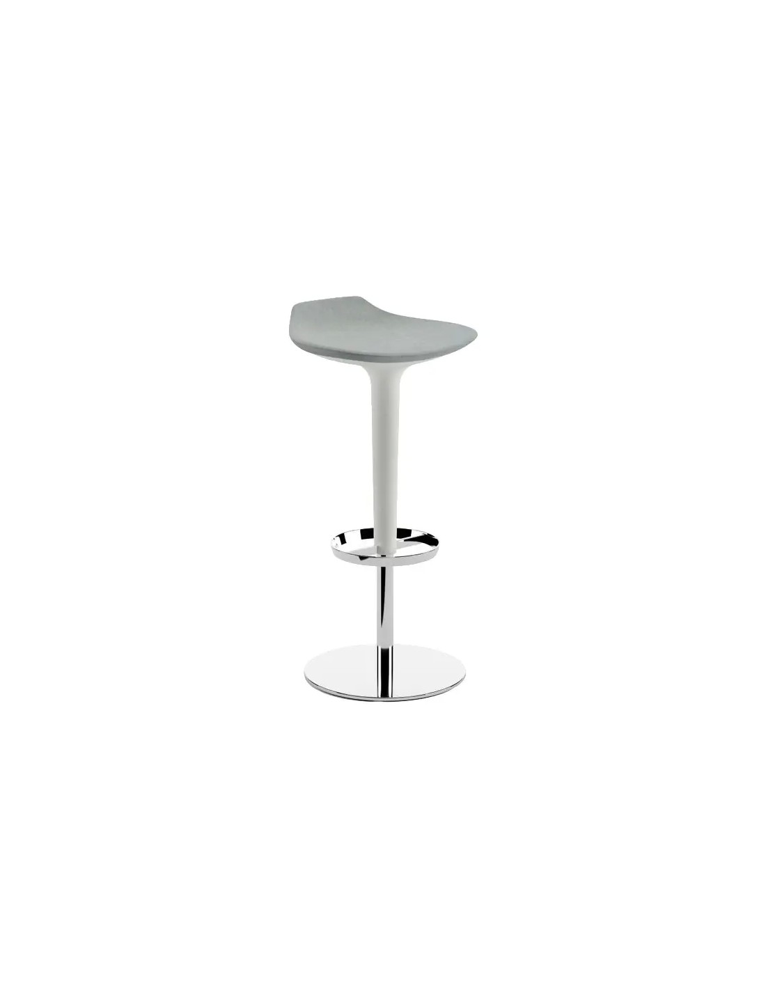 Sgabello con fusto in acciaio inox, in finitura satinata o cromata, con seduta dotata di schienalino e cuscino rivestito in tessuto, pelle, tessuto spalmato o rivestimento cliente.
