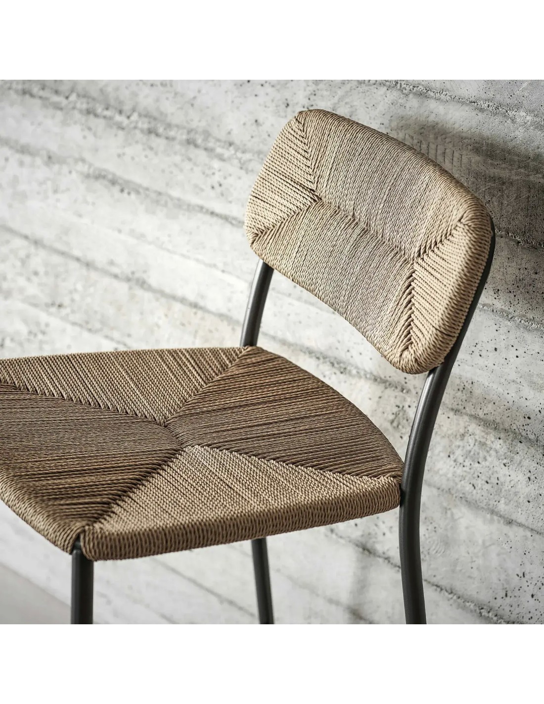 Ogni sgabello First Steps è caratterizzato da una lavorazione manuale meticolosa. L'intreccio della seduta e dello schienale è disponibile in paglia di fiume ritorta, per un'estetica più rustica e organica, oppure in cordoncino in carta di pura cellulosa (nelle varianti naturale o antracite), per un risultato più grafico e moderno. Questa particolare lavorazione conferisce alla seduta una texture vibrante che definisce il carattere dell'intero arredo. Per mantenere la stabilità dell'intreccio e la sua tensione originaria, la seduta è fissa e non sfoderabile.
