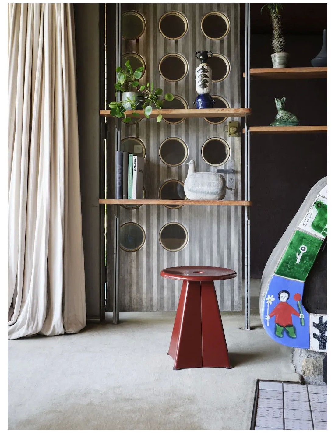 VitraIl pratico sgabello Tabouret Métallique (1936) di Jean Prouvé, utilizzabile anche come tavolino di appoggio, presenta affinità strutturali con il successivo tavolo Trapèze.