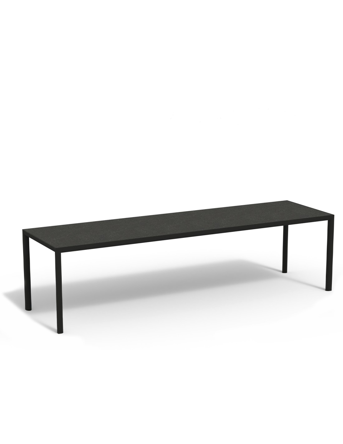 Il piano in gres corre su tutta la lunghezza di 280 cm, enfatizzando l'orizzontalità del tavolo da pranzo, soprattutto nella versione con profondità 80 cm. Sobria ricercatezza per un arredamento outdoor di grande eleganza e semplicità.