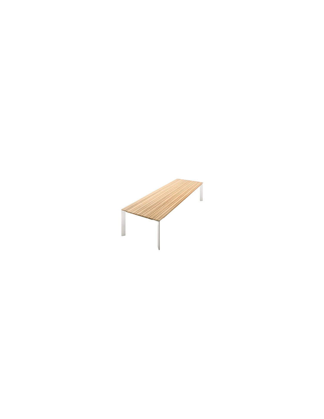 Tavoli da pranzo. La serie Sunset comprende anche un tavolino. Struttura: acciaio trattato con cataforesi e verniciato opaco nei colori avorio o wengé. Puntali in materiale plastico. Piano: legno di sassafrasso – naturale, abbinato a strutture color avorio; – tinto wengé, abbinato a strutture color wengé. Note: Il legno di sassofrasso è sottoposto a un trattamento idro-oleorepellente a base di acqua che limita l’assorbimento di liquidi e sostanze grasse.