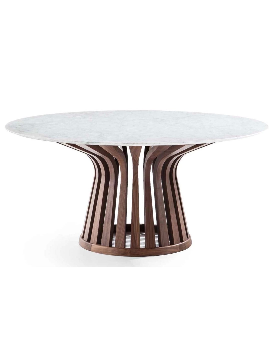 Lebeau Wood è uno straordinario esemplare di tavolo in legno massello che evolve l'originale tavolo di Patrick Jouin conservandone le misure e le sagome originali, seppur rivoluzionando la struttura con una nuova soluzione materica. Il connubio tra la manualità degli artigiani di Meda e i più moderni macchinari a controllo numerico da vita a una costruzione estremamente innovativa in cui la base del tavolo con piano rotondo si compone di 22 doghe in legno massello curvato. Il risultato è un arredo di design di grande pregio e versatilità, interpretabile con la struttura di sostegno in legno di frassino o noce canaletto in abbinamento al piano in frassino, nelle diverse finiture di marmo e nella versione in vetro.