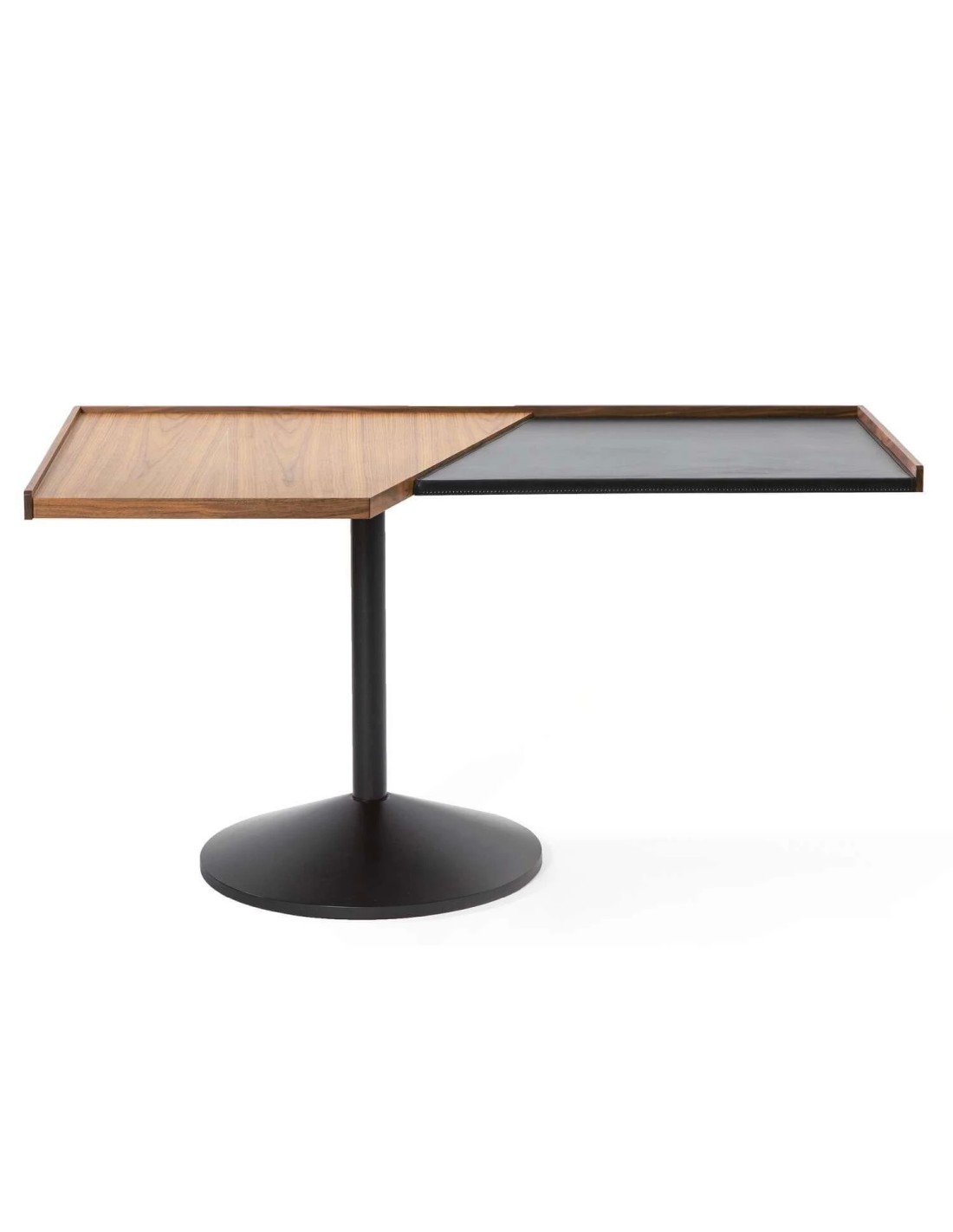 Il tavolo-scrittoio disegnato da Franco Albini si distingue per l'impatto generato dai due piani accostati di forma trapezoidale sorretti da un unico basamento in acciaio per un arredo di grande raffinatezza tattile e visiva. La struttura con una sola gamba conferisce al design moderno un effetto di apparente instabilità, che nella diseguaglianza equilibrata dei piani evoca la forma della bilancia, mentre gli spessori differenti delimitano la cornice accentuando il tratto esterno.