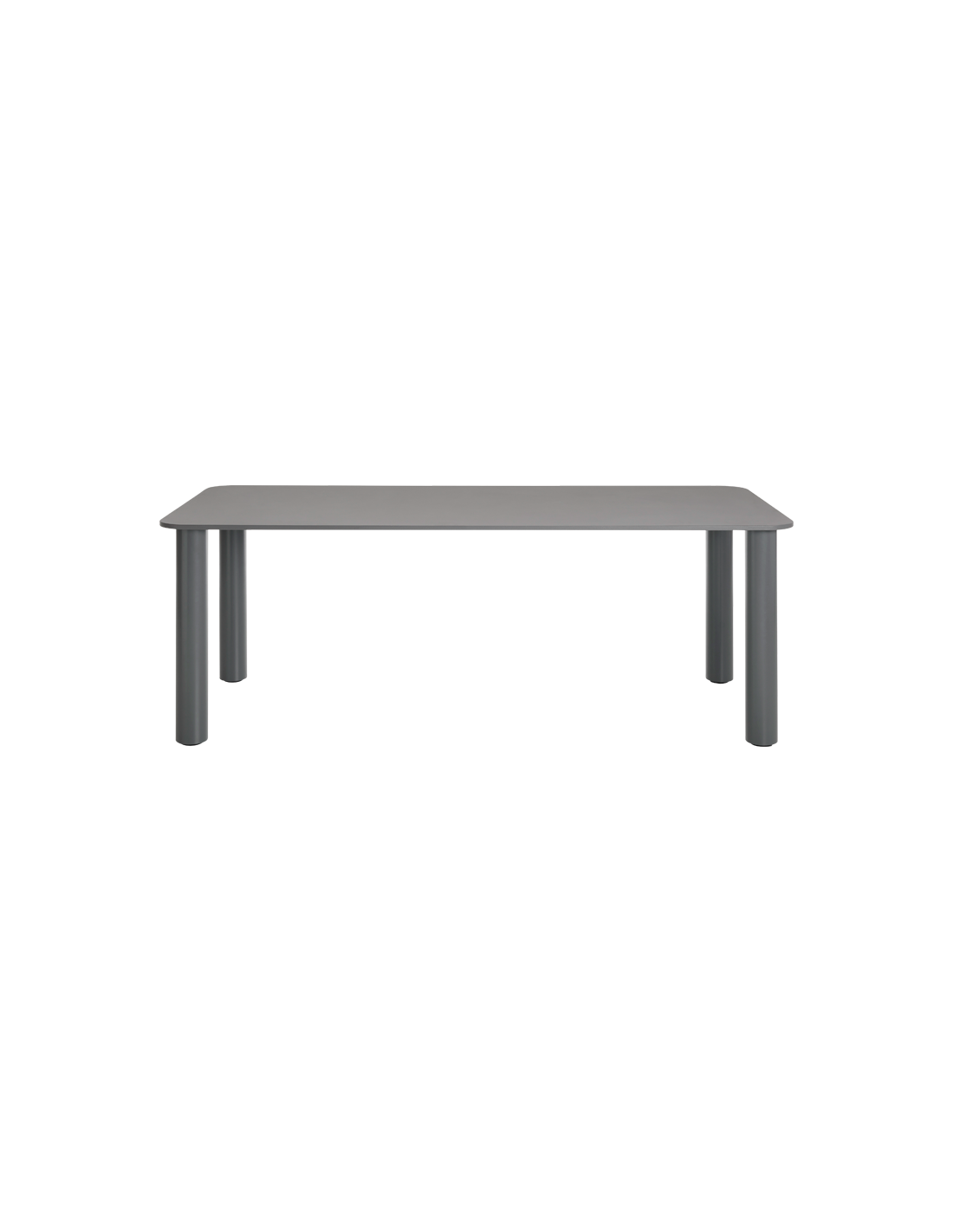 Piano in vetro piatto, trasparente o rivestito in cemento acrilico - nella tonalità antracite - con trattamento protettivo nanotecnologico antimacchia. Gambe removibili, in acciaio inox 18/8, abbinato al piano trasparente, oppure in acciaio verniciato antracite, abbinate al piano rivestito in cemento.