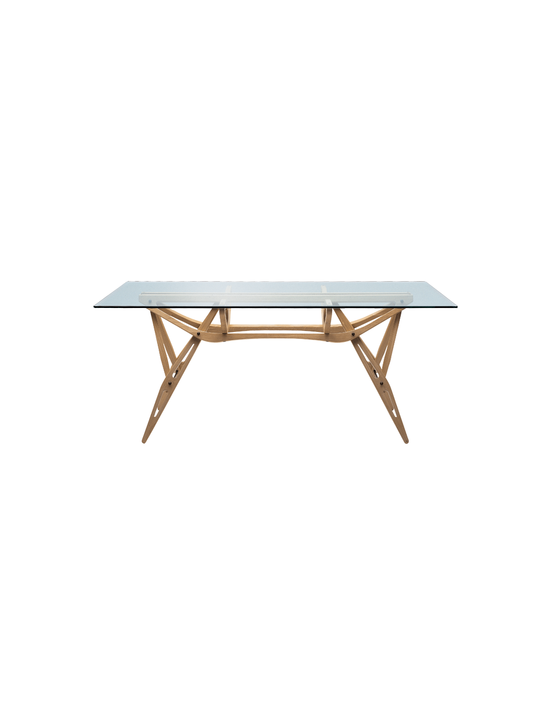 Reale di Zanotta - Tavolo. Piano in vetro trasparente spessore 15 mm, con o senza bordi smussati o in marmo Emperador spessore 20 mm, con vernice protettiva antimacchia, in poliestere trasparente opaco. Struttura in massello di rovere naturale o verniciato nero, oppure in rovere tinto noce Canaletto; vernice rifinita con cera. Forme articolate e complesse, che una volta comprese stupiscono per l'intelligenza costruttiva di un meccanismo perfetto dove ogni elemento si incastra, abbina, gemella con precisione ad altri, attraverso puntuali (e progettati ad hoc) sistemi metallici di unione. Veri e propri capolavori, come il tavolo Reale, risolto da un'ossatura compatta e trasparente ancor più valorizzata da un piano di cristallo che sembra volerla incorniciare. A metà degli Ottanta Zanotta scopre l'opera di Carlo Mollino e inizia la produzione di alcuni mobili disegnati da questo eccentrico architetto torinese. Rifiutando le teorie dell'International Style, Mollino propone una nuova poetica privilegiando forme organiche e romantiche e l'uso di materiali naturali quali il legno. I mobili di Mollino sono un concentrato di romanticismo ed ironia. Nel 1990 Zanotta riedita il tavolo Reale disegnato da Mollino nel 1947 per gli uffici della Reale Mutua assicurazioni di Torino. Con la produzione del Reale, Zanotta dà continuità alla ricerca intrapresa per recuperare oggetti del passato, rappresentativi di momenti salienti della storia dell'architettura e del design italiano.