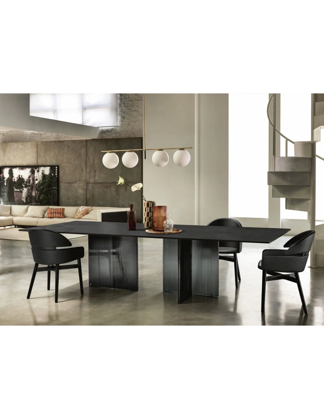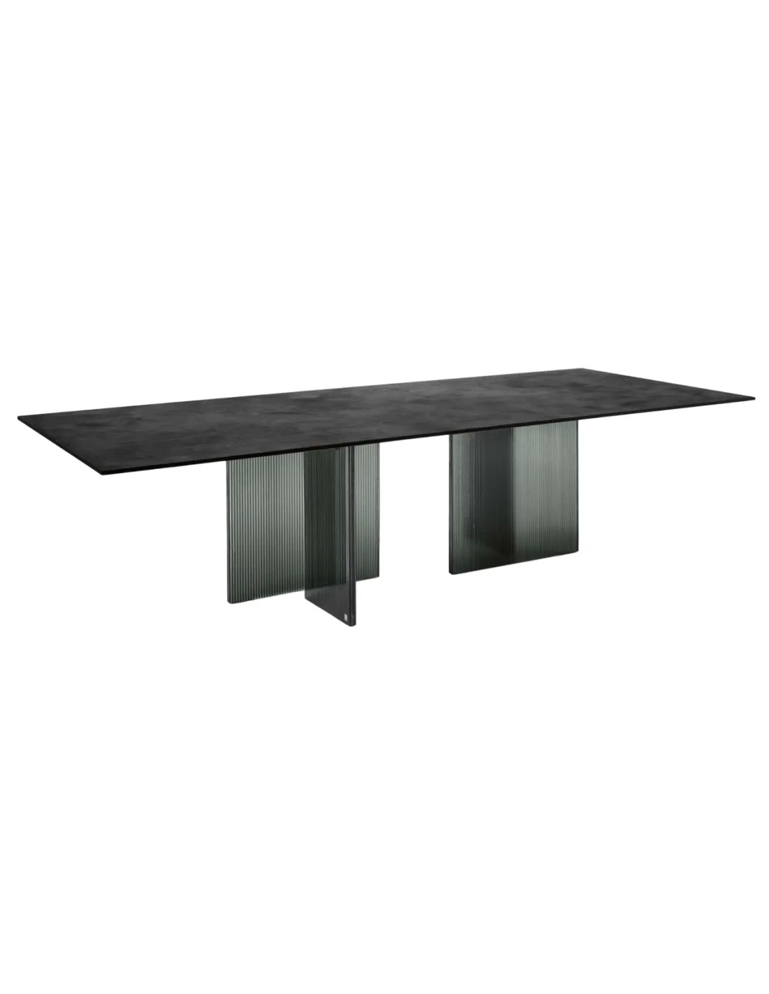Tavolo con base composta da quattro o sei elementi in DV Glass da 30 mm a strisce colorate. Piano temperato in vetro da 15 mm trasparente retroverniciato con tinte monocromatiche, oppure ricoperto in Ecomalta, spatolatura tipo fine, oppure in legno impiallacciato noce canaletto finitura Tabacco.