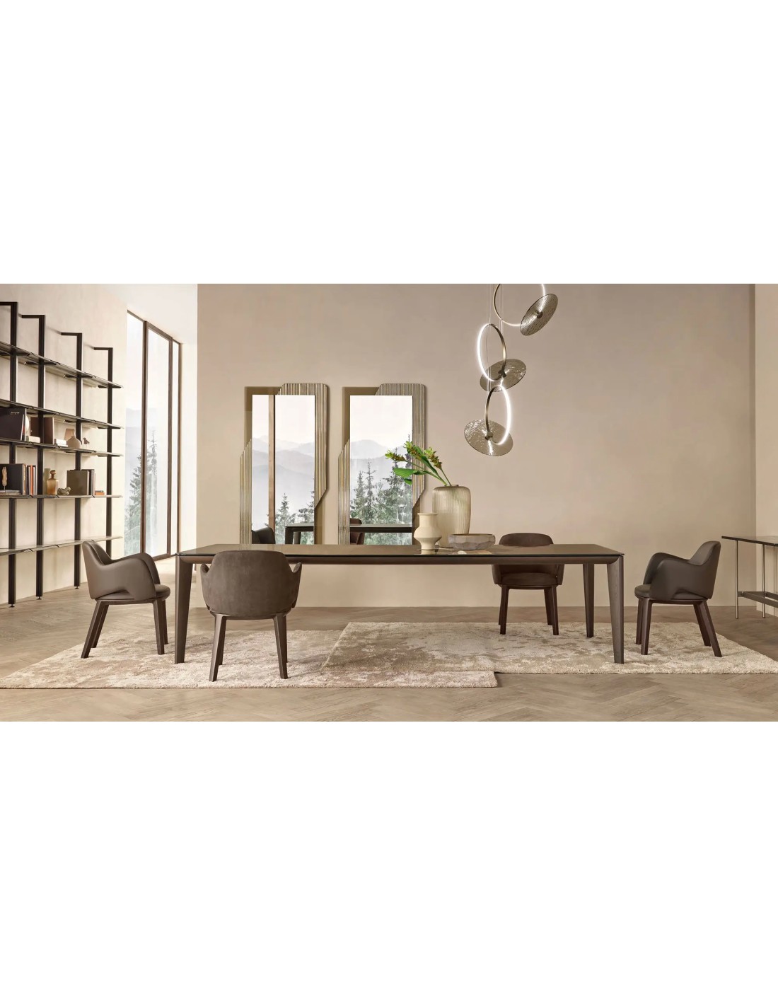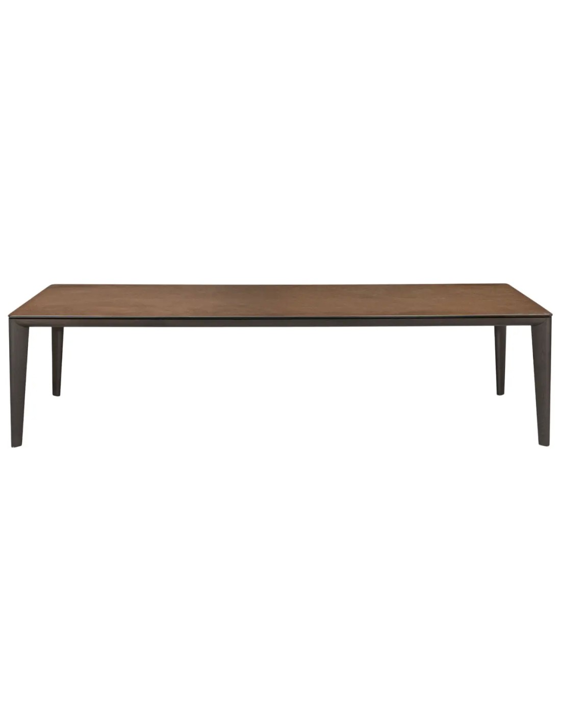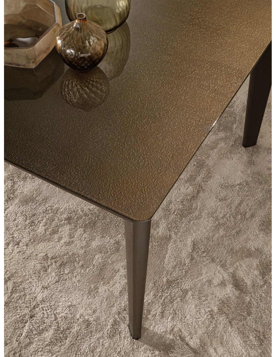 Tavolo con piano in vetro da 12 mm fuso a gran fuoco e temperato, retrovernciato con tinte metallizzate. Struttura in legno massello disponibile nelle finiture Tabacco o termotrattato nero.