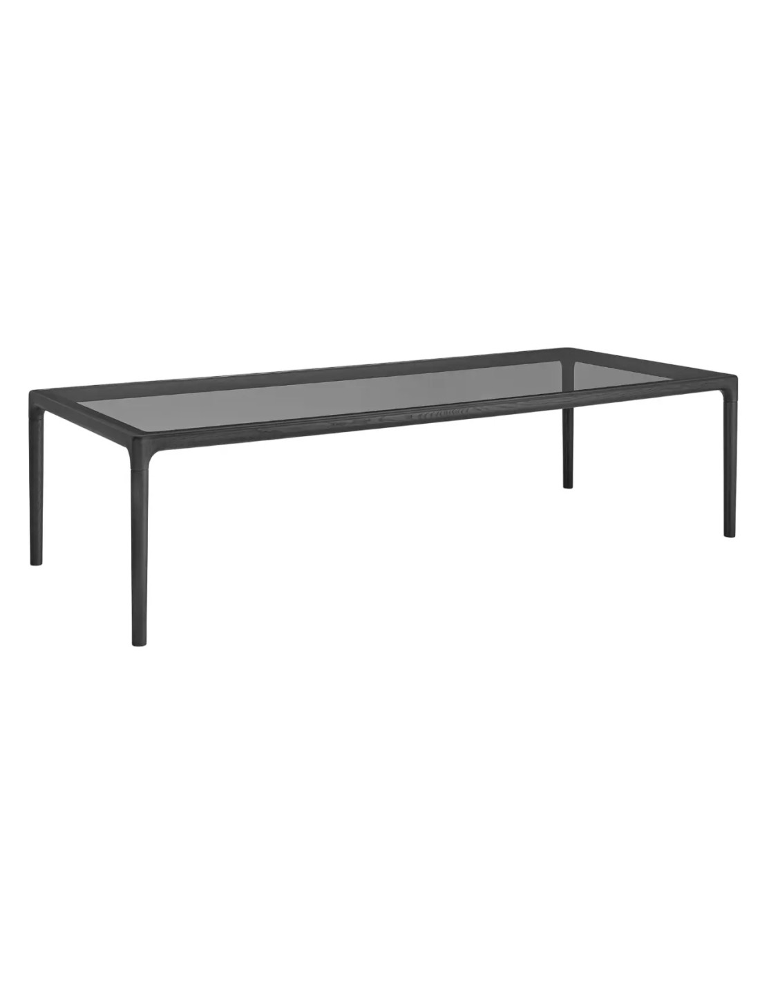 Tavolo con piano in vetro da 8 mm temperato, struttura in legno massello disponibile nelle finiture Tabacco o Nero.