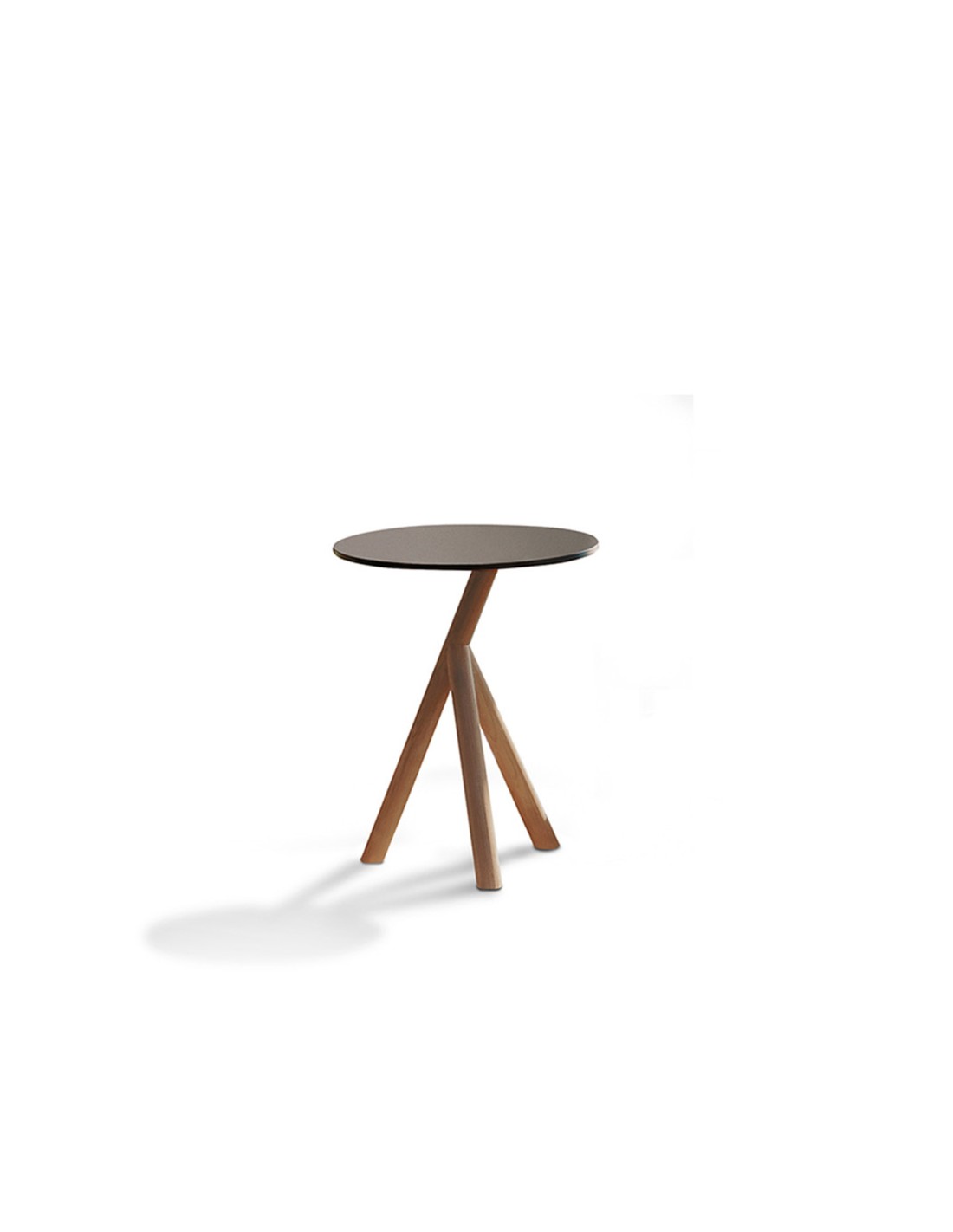 Protagonista assoluto è il teak, modellato nell'appoggio a tripode che sostiene con leggerezza il piano in HPL grigio. La portata massima del piano è di 2kg.