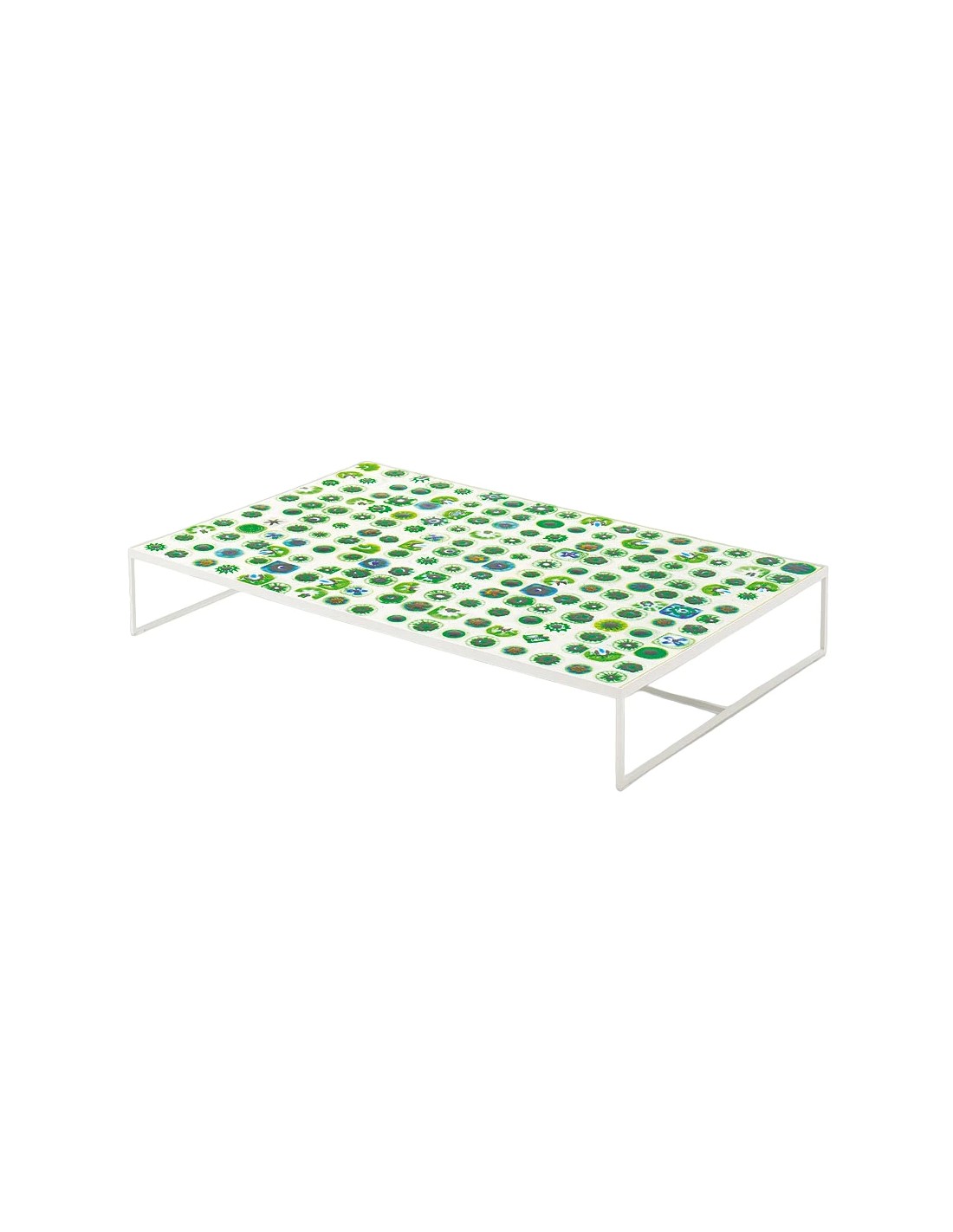 Il Tavolino Bloom Paola Lenti presenta un particolare caratteristico degli arredi disegnati da Marella Ferrera: le piastrelle decorate ognuna con un disegno diverso e unico nel suo genere.