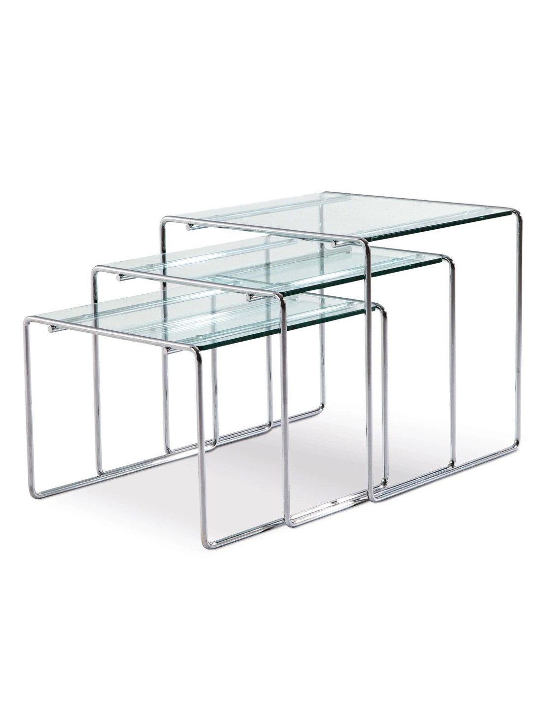 I tavolini di design impilabili Marcel T formano un trittico di forme leggere e sovrapponibili realizzate applicando il tondino di acciaio cromato, tratto materico distintivo di molti progetti del maestro giapponese Takahama. Posizionabili in modo trasversale come tavolini da soggiorno, da salotto o per la zona studio, si presentano sia nella versione con piano in vetro float trasparente che nella variante con verniciatura poliestere nella finitura lucida opaca o specchiante.