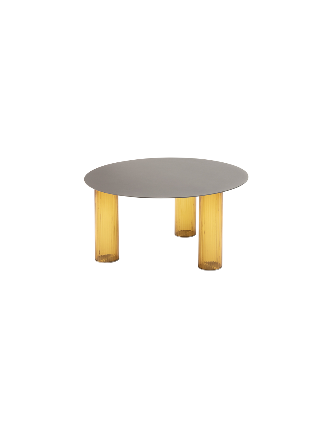 ZanottaEchino di Zanotta - Tavolino. Gambe in vetro soffiato a tre strati nei toni del grigio fumè e dell'ambra. Piano in lamiera d'acciaio, spessore 4 mm, con finitura nichel-satinata