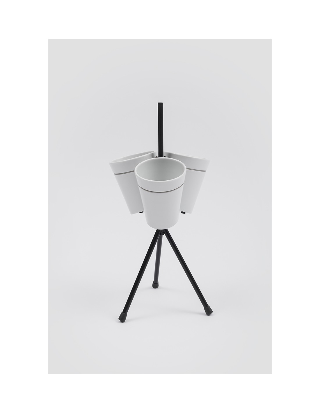 Window garden table fa parte della collezione dei sistemi di vasi per coltura idroponica. Tre vasi in porcellana bianca stampata ad alta pressione, sorretti da un sottile supporto metallico centrale con base a treppiede, reinterpretano in modo innovativo uno stile di vita urbano evidenziando un accento green nell'arredamento.